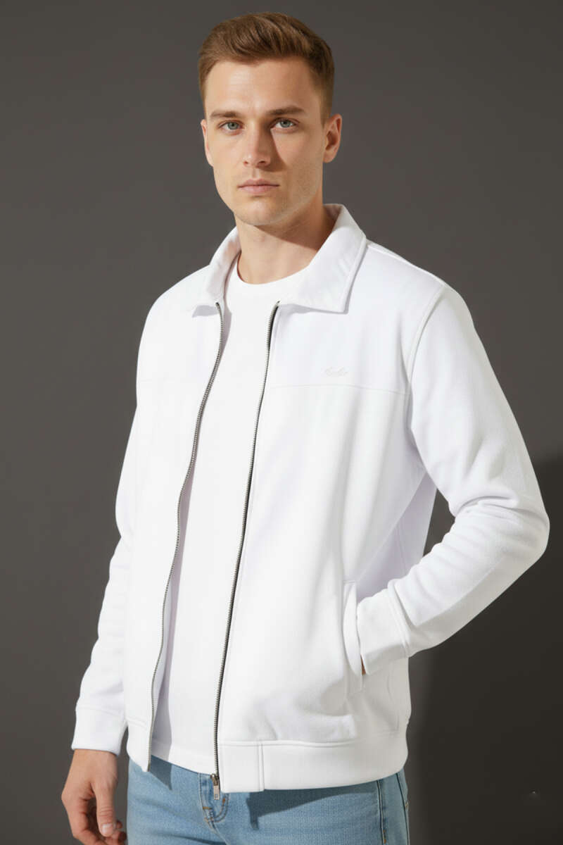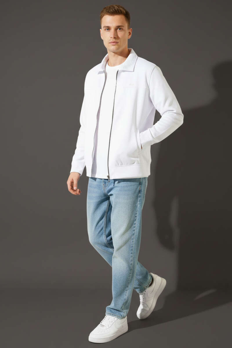 Şerit Yakalı Çıtçıtlı Erkek Sweatshirt Beyaz