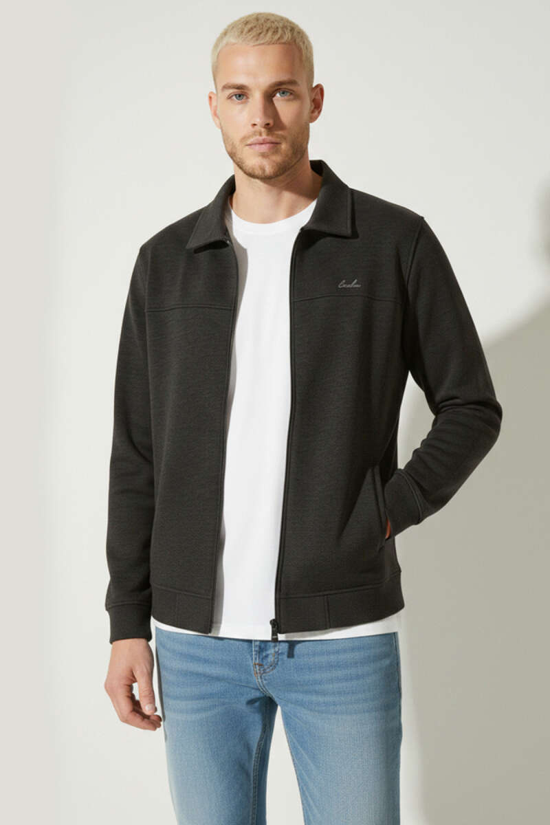 Polo Yaka Fermuarlı Basic Erkek Sweatshirt Gri