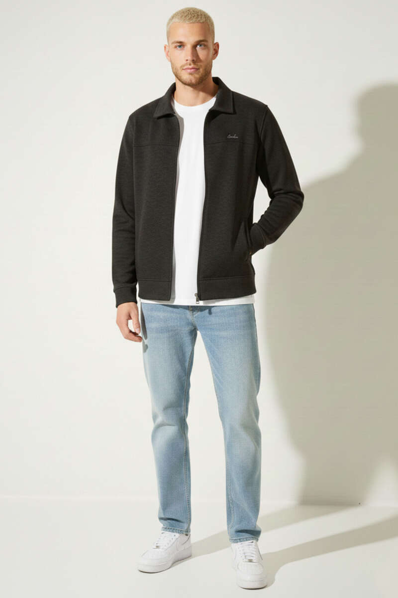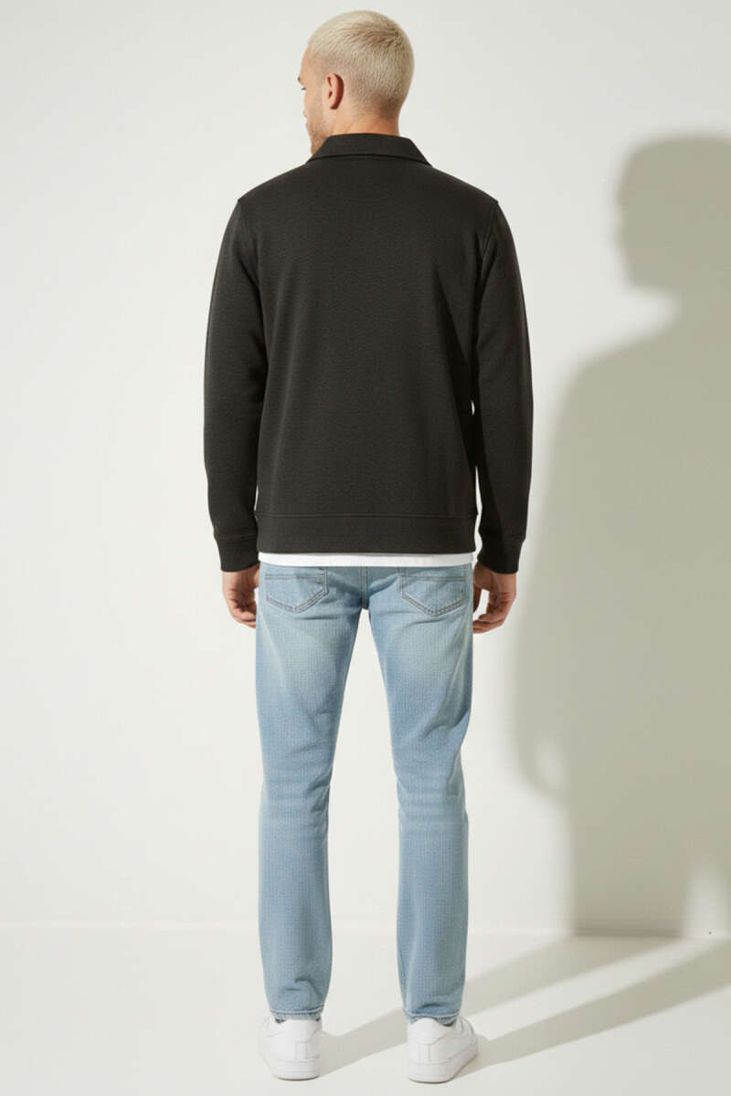 Polo Yaka Fermuarlı Jakarlı Erkek Sweatshirt Siyah