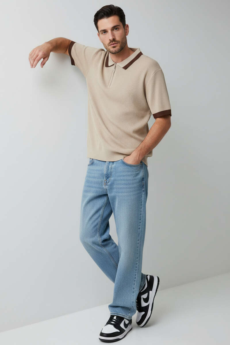 Polo Yaka Fermuarlı Merserize Triko T-Shirt Bej