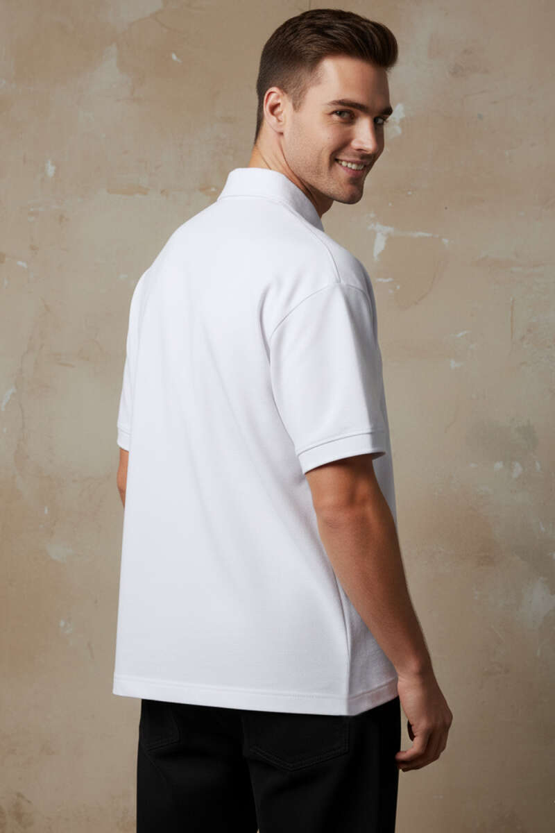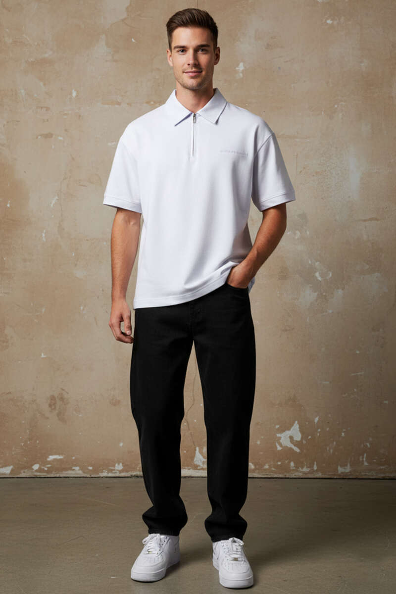 Yaka Fermuarlı Armalı Erkek T-shirt Beyaz