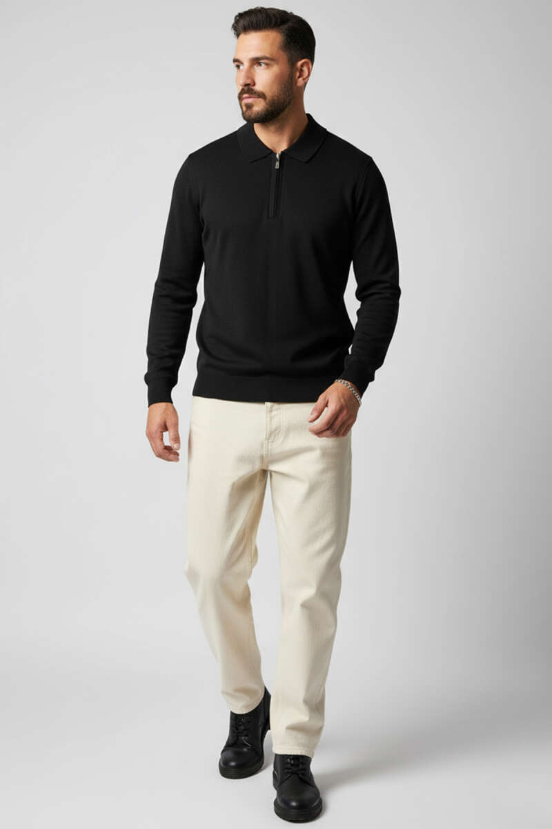 Yaka Fermuarlı Erkek Triko Kazak Siyah