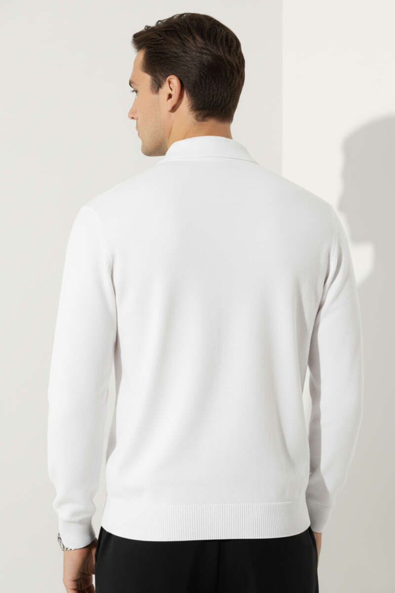 Polo Yaka Çizgi Detaylı Erkek Kazak Beyaz