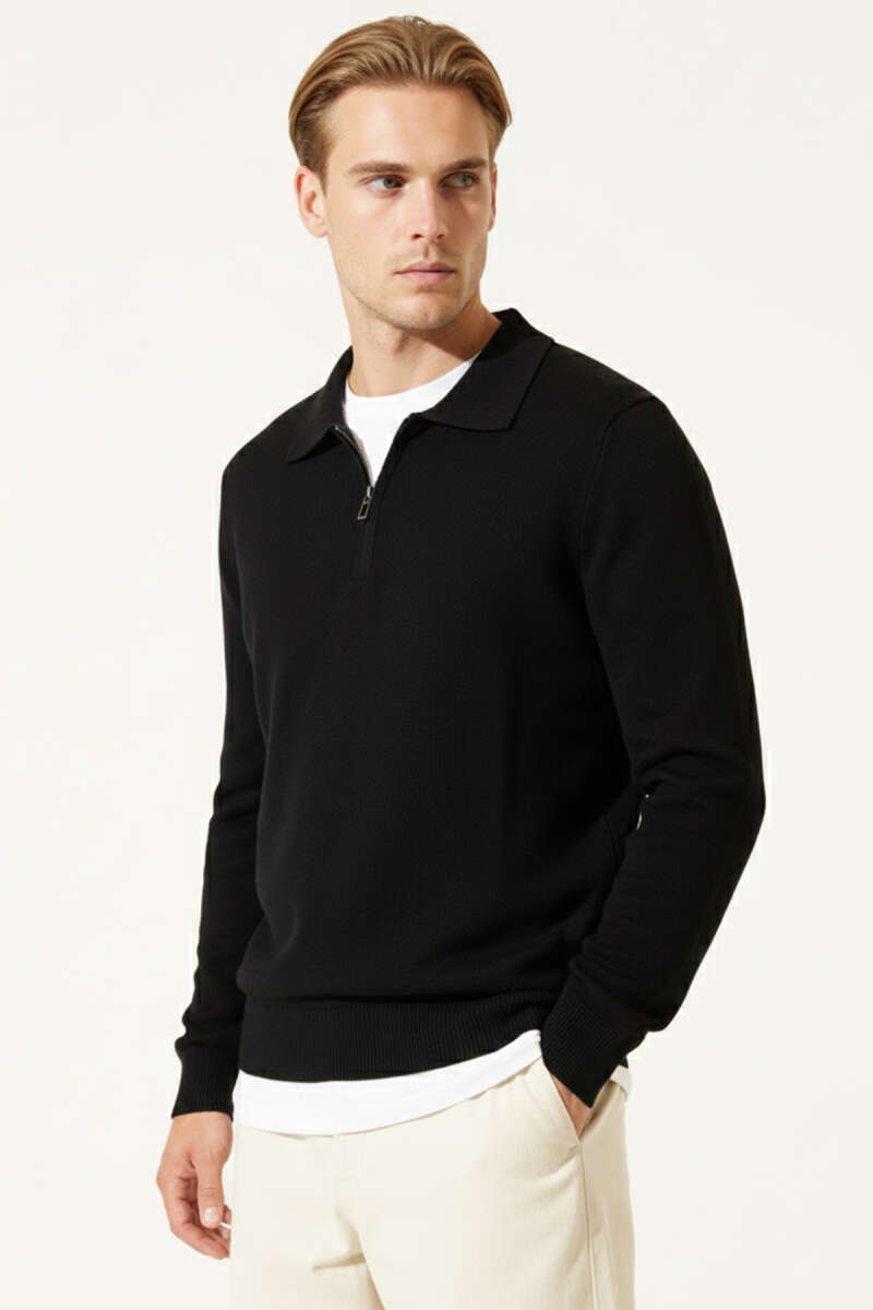 Polo Yaka Çizgi Desenli Kazak Siyah