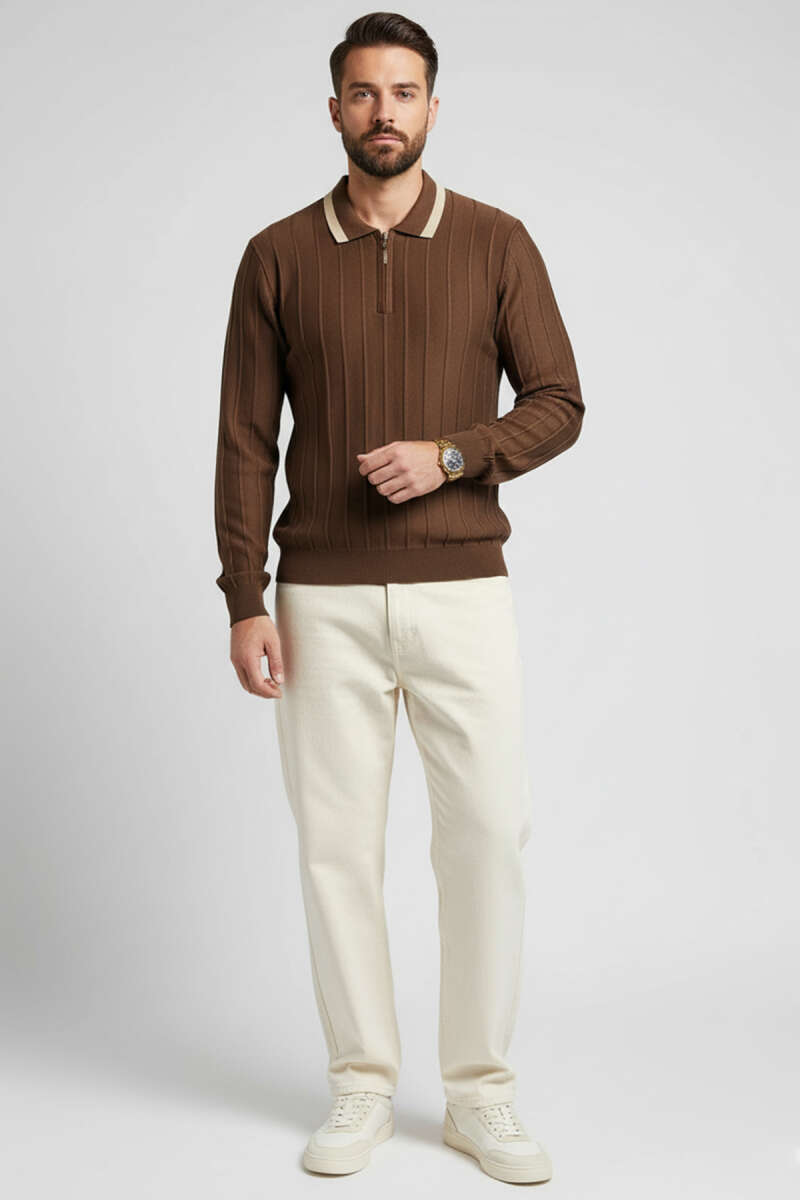 Dik Yaka Yarım Fermuar Erkek Sweatshirt Kahve