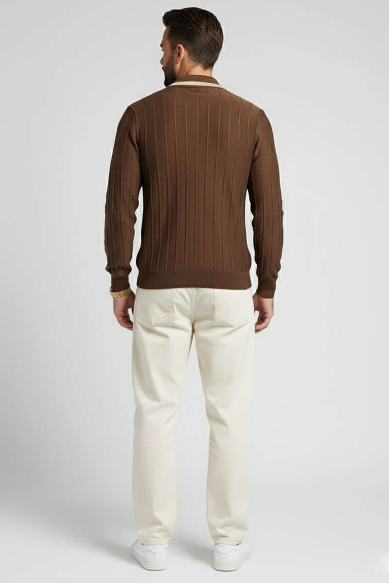 Dik Yaka Yatay Çizgili Erkek Sweatshirt Kahve