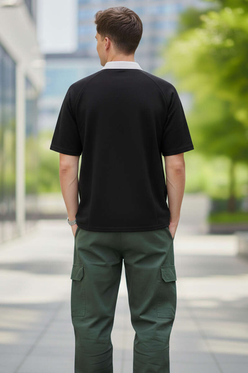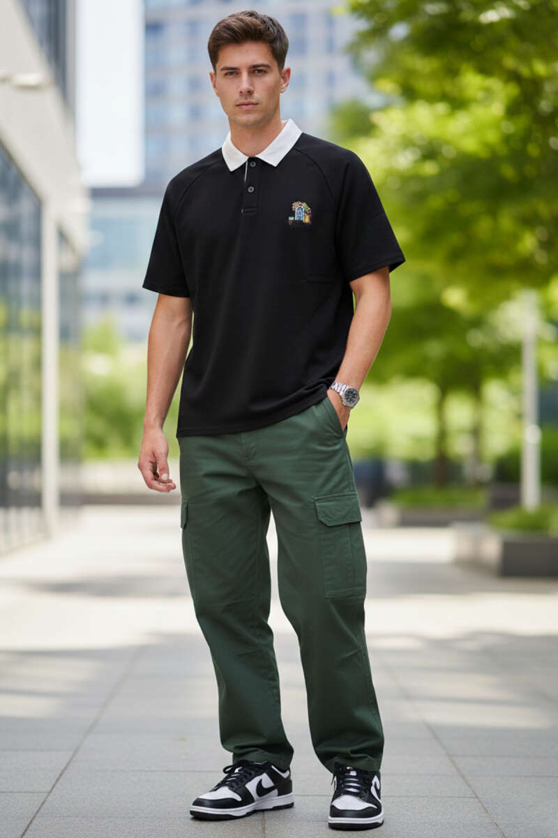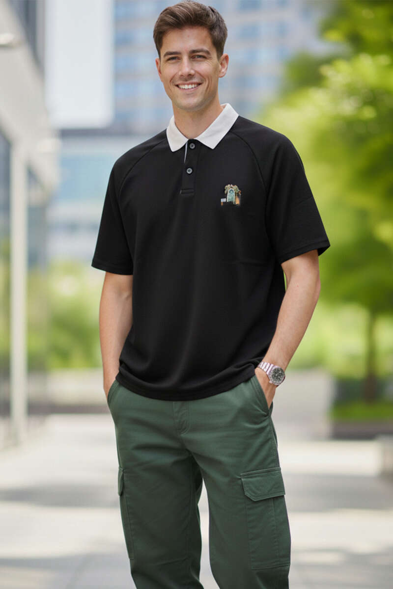 Polo Yaka Nakışlı İki İplik T-shirt Siyah