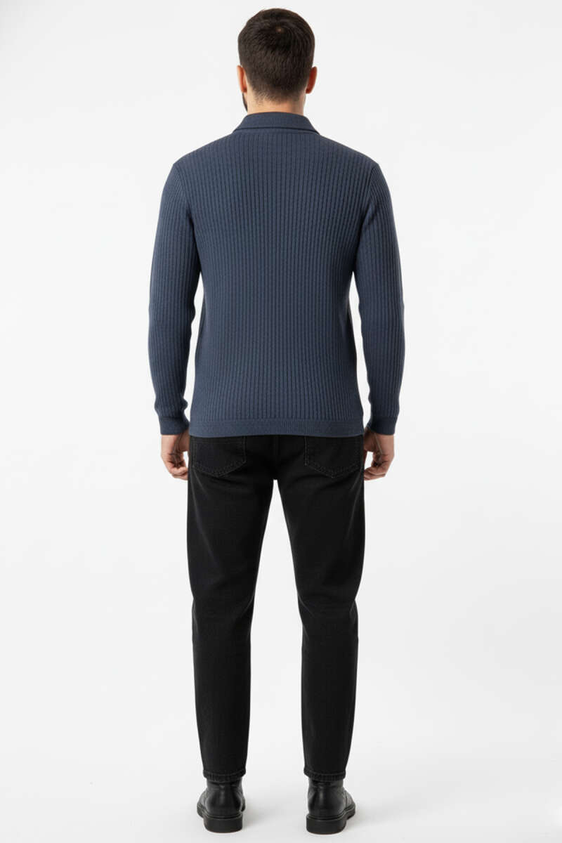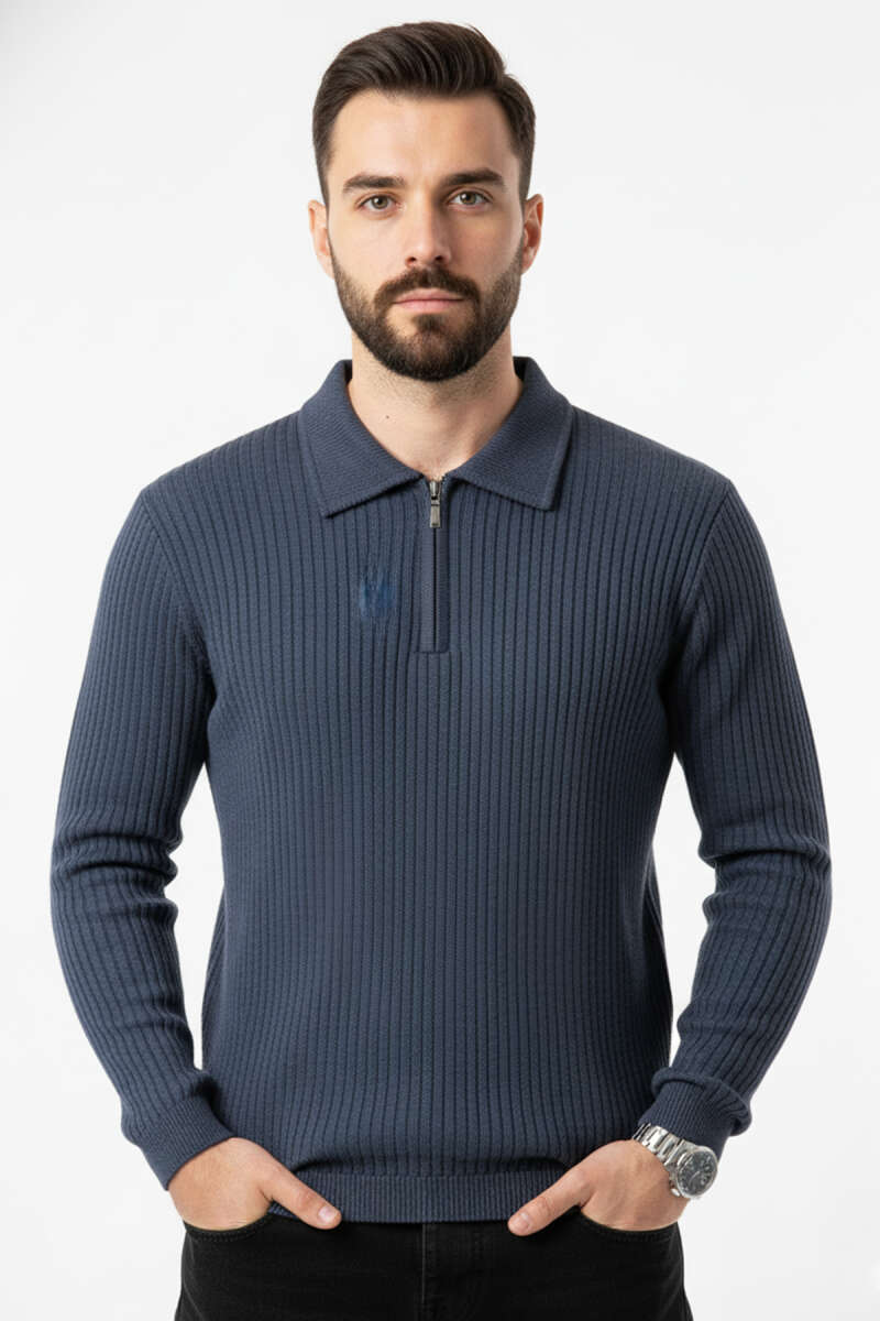 Polo Yaka Dikey Çizgili Triko Erkek Kazak Lacivert