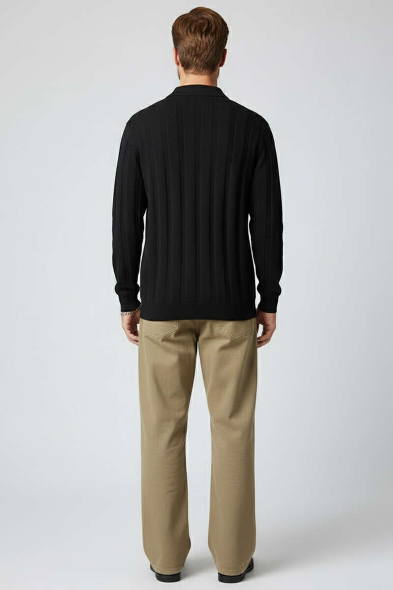 Polo Yaka Petek Örme Detaylı Triko Erkek Kazak Siyah