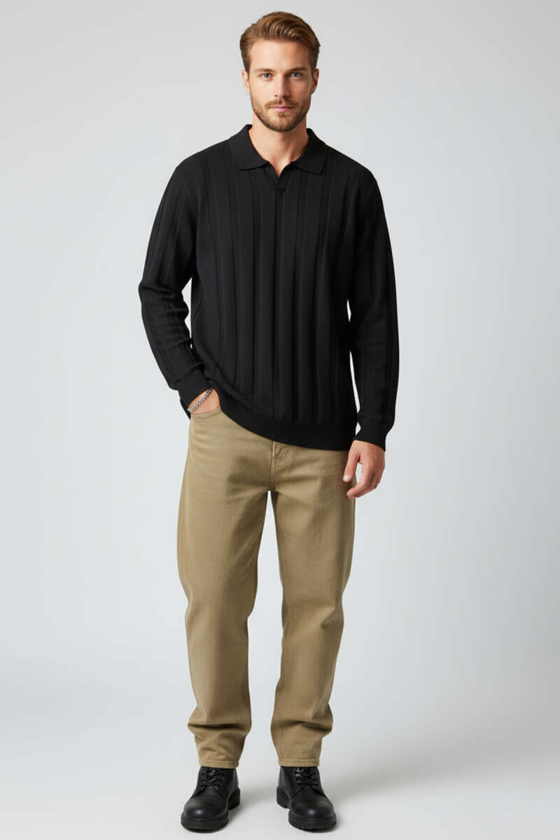 Polo Yaka Petek Örme Detaylı Triko Erkek Kazak Ekru