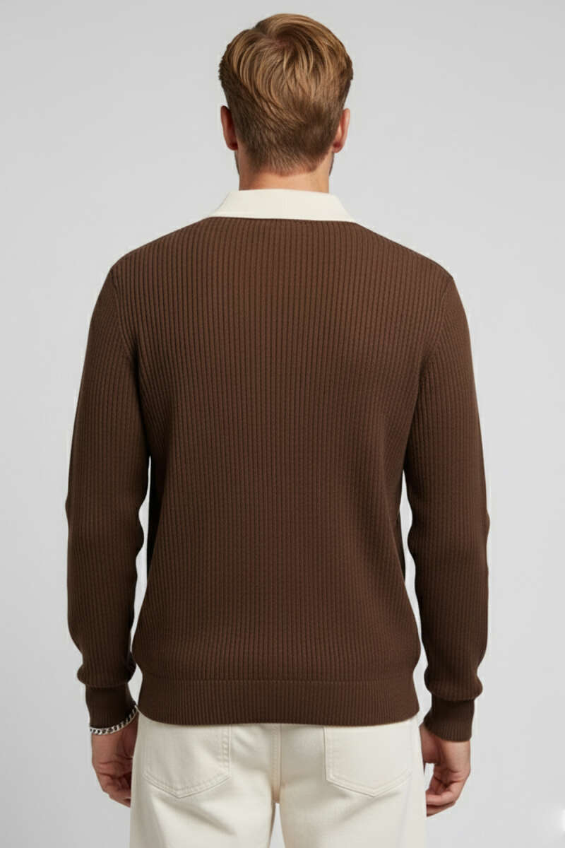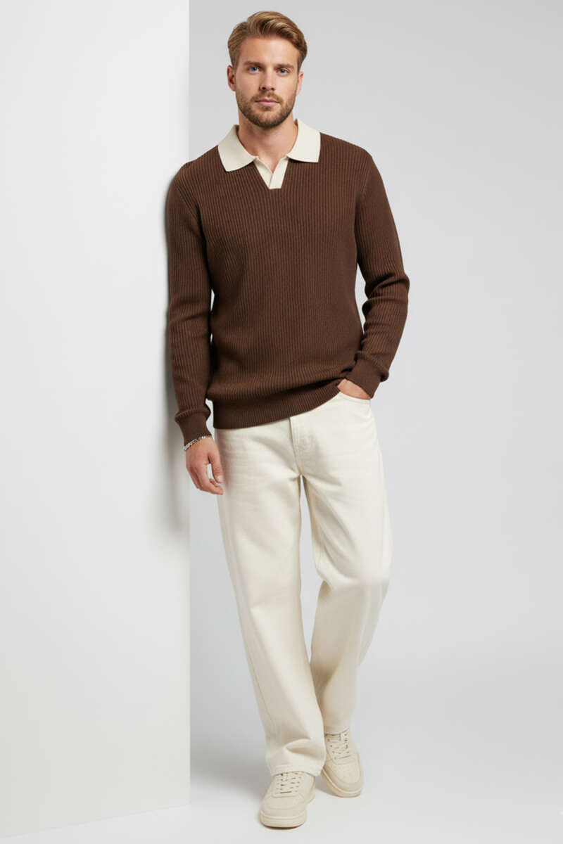 Yatay Çizgi Fitilli Erkek Triko Kazak Bej