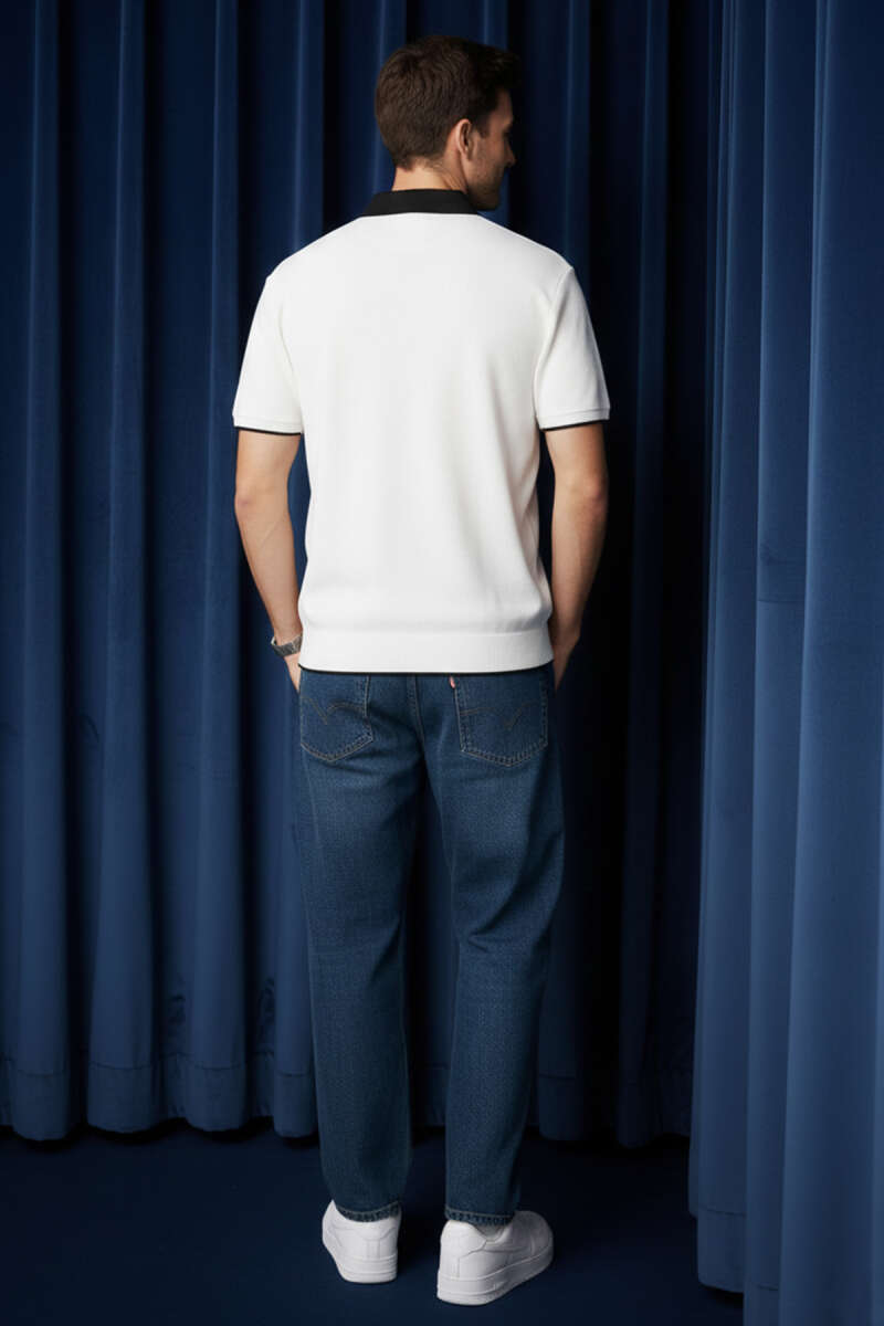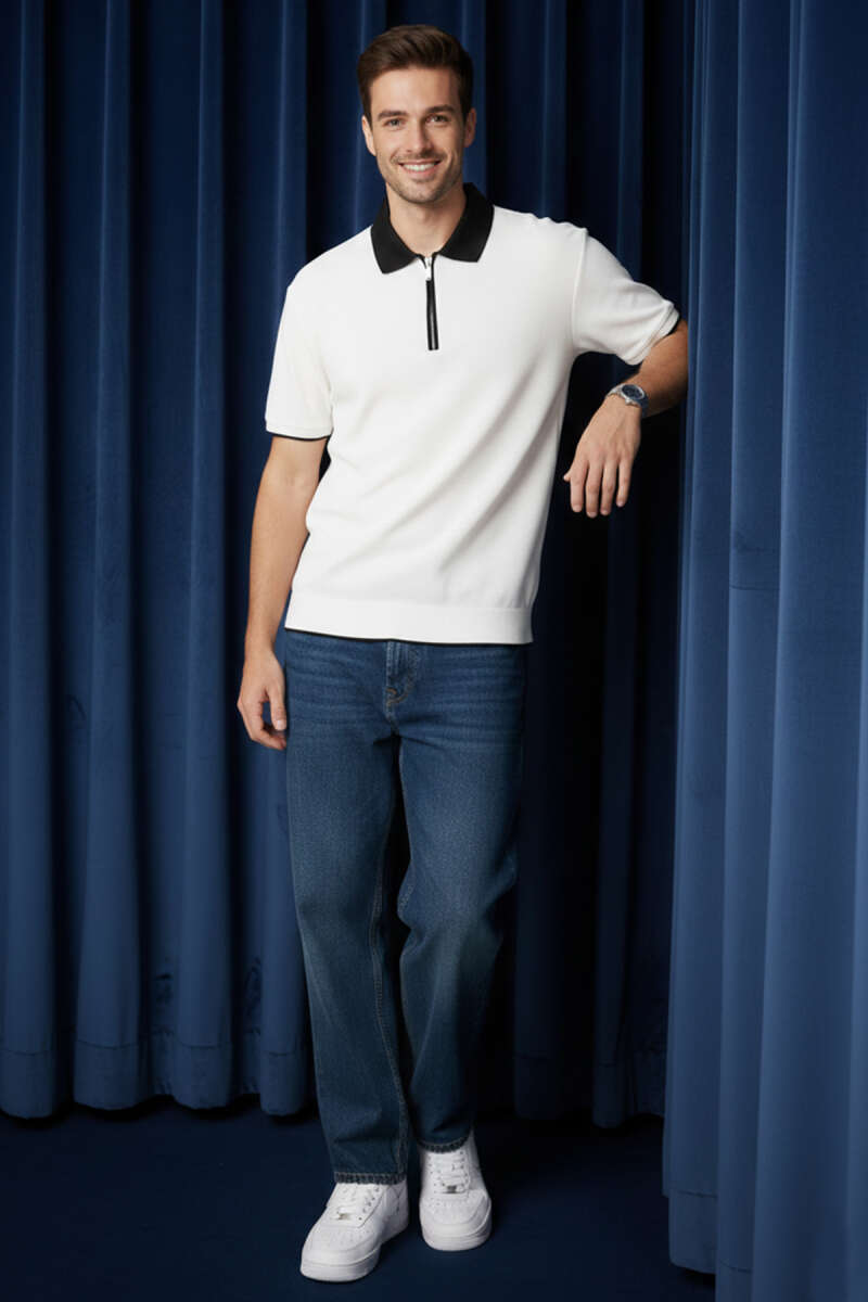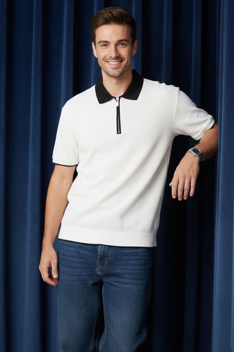 Polo Yaka Ribanalı Fermuarlı Erkek T-shirt Ekru