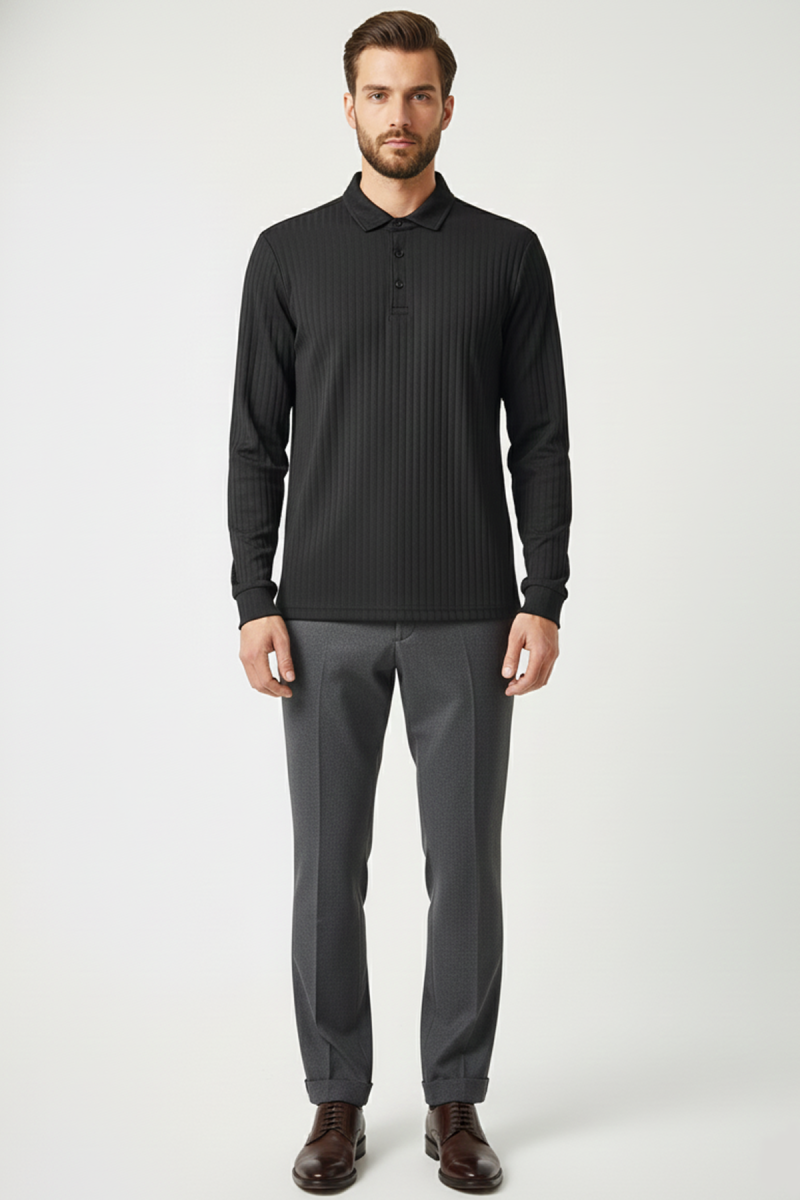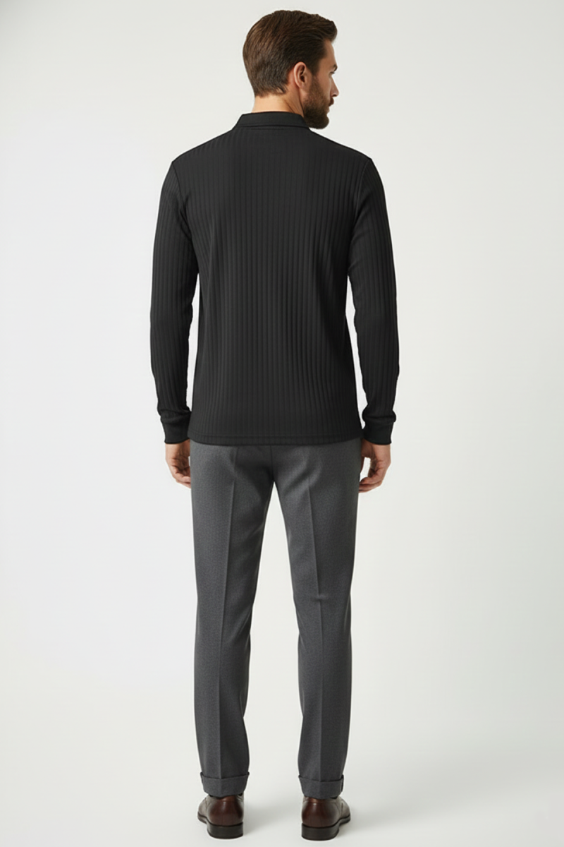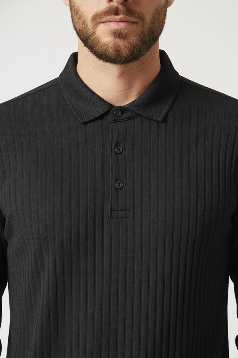 Polo Yaka Kabartma Çizgili Erkek Sweatshirt Siyah