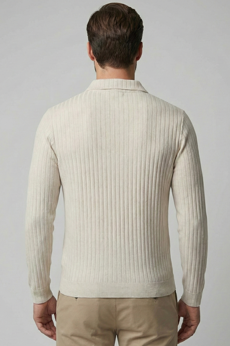 Polo Yaka Kabartma Çizgili Erkek Sweatshirt Ekru