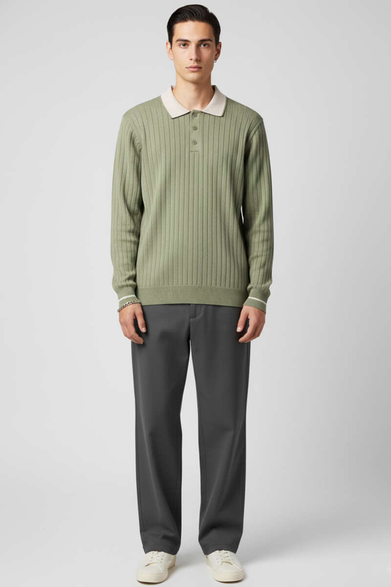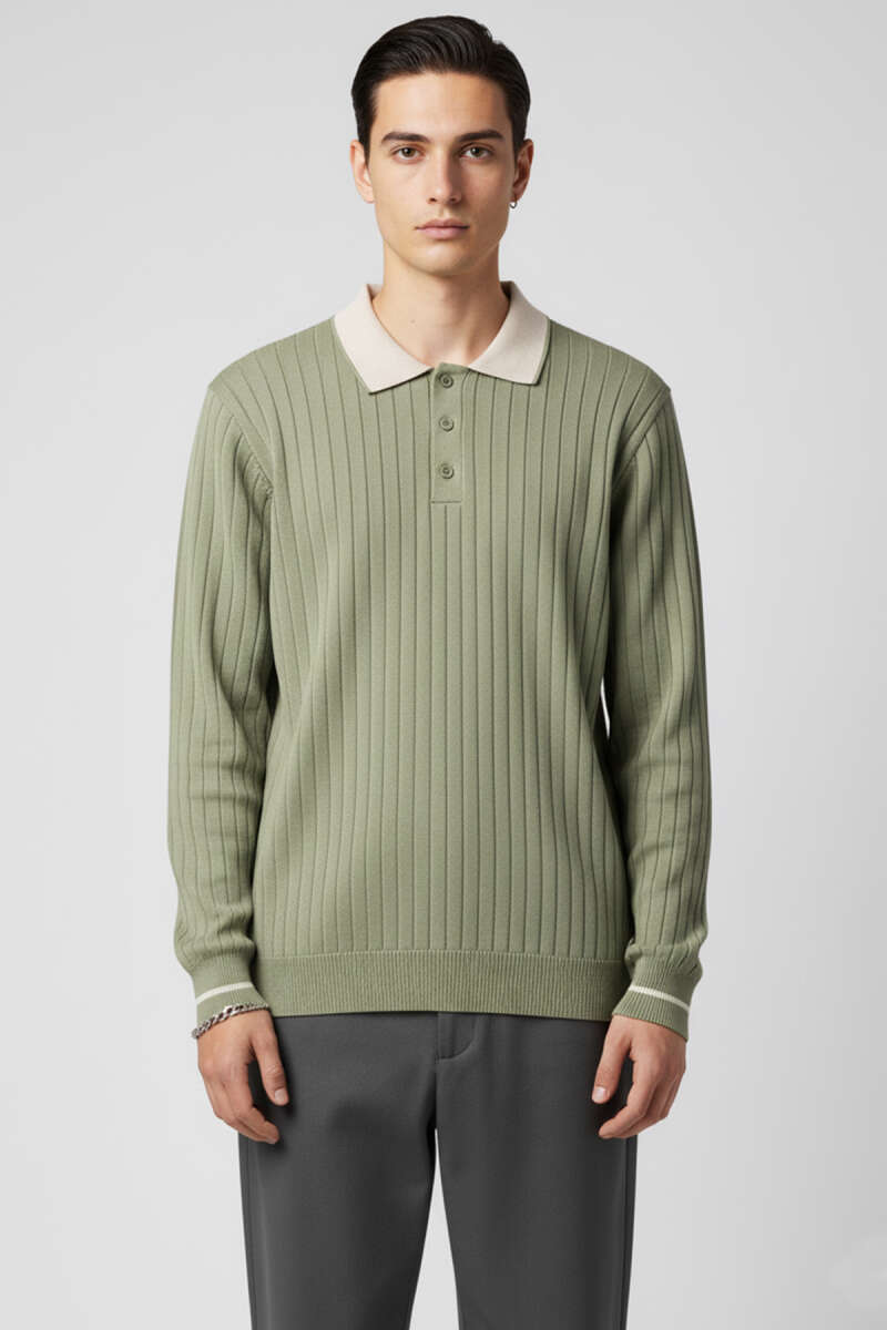 Polo Yaka Uzun Kollu Erkek Triko Sweatshirt Bej