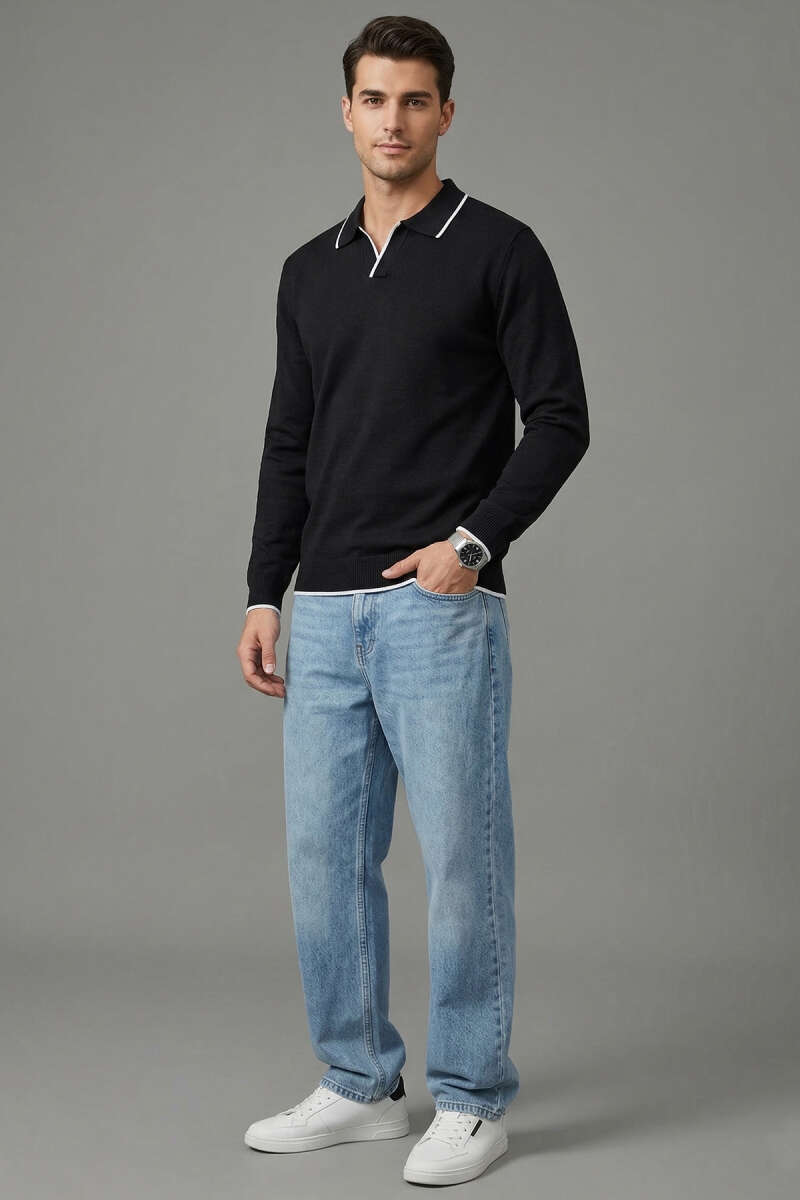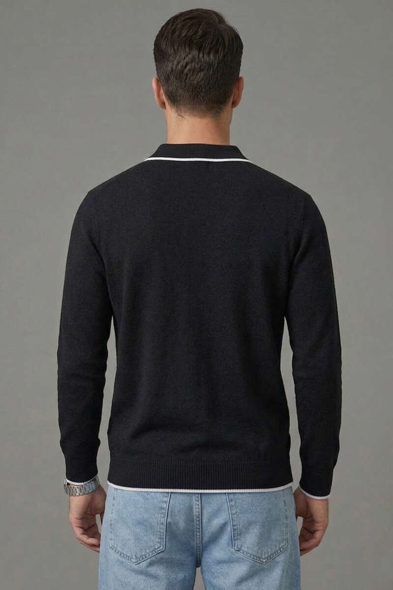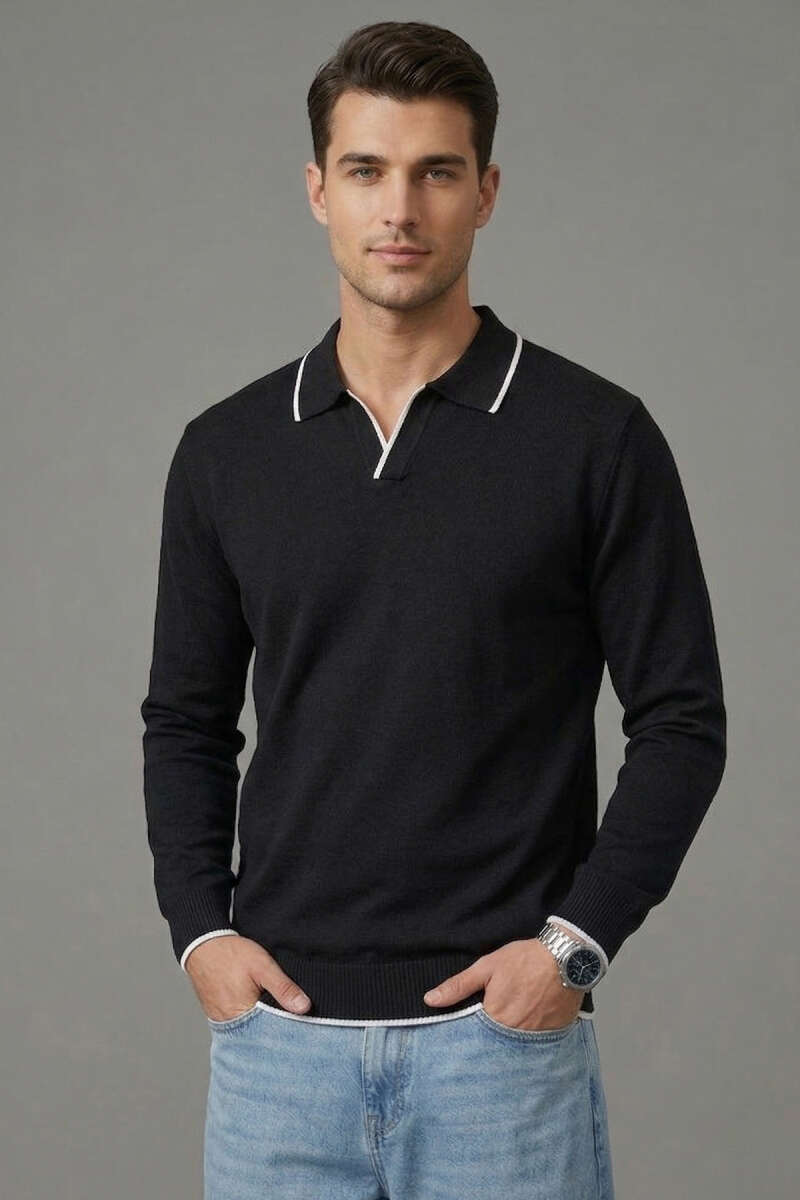 Polo Yaka Uzun Kollu Erkek Triko Sweatshirt Siyah