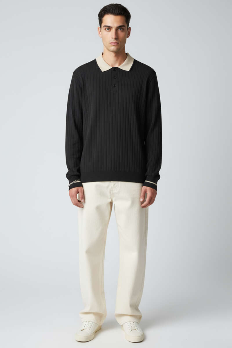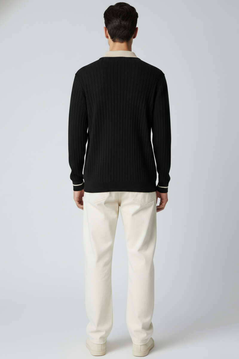 Polo Yaka Uzun Kollu Erkek Triko Sweatshirt Beyaz