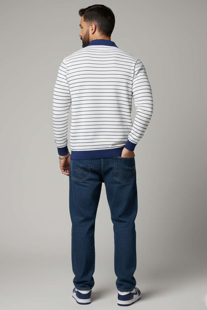 Desenli Polo Yaka Fermuarlı Kazak Lacivert