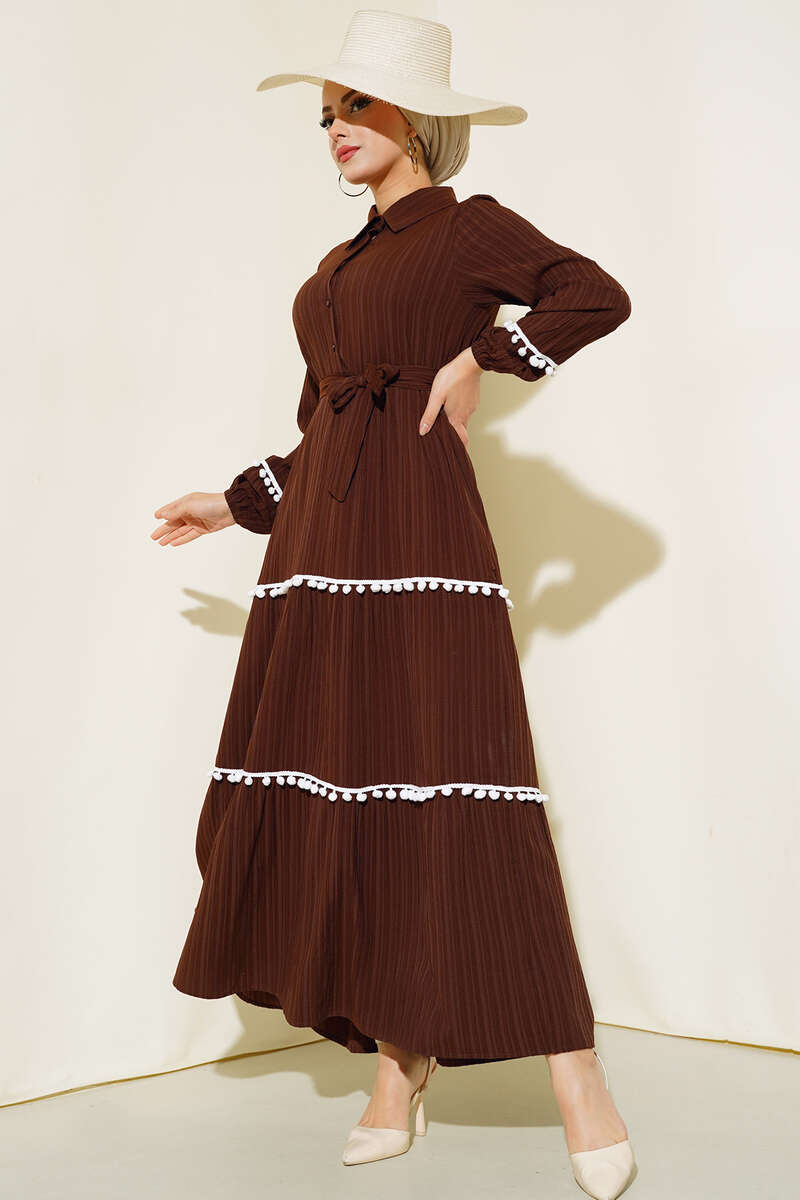 Yeni sezon elbisemiz sizlerle beraber. Elbisemizin kol bilekleri ve eteği ponpon detaylıdır. Elbisemiz gömlek yaka olup, yarıya kadar düğmelidir. Belinde iki adet kemer köprüsü olup, kendi kumaşından kuşağı vardır. Kol bilekleri lastiklidir. Renk seçenekleri olan elbisemiz dolaplarınızda yerini beklemektedir.