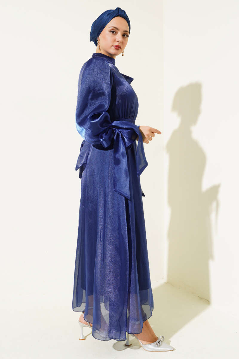 Bel Taşlı Pelerinli Abiye Elbise Lacivert