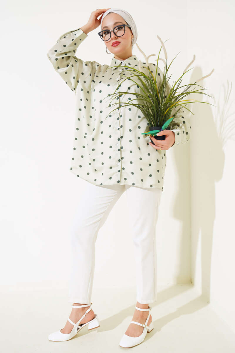 Puantiye Desen Saten Gömlek Çağla Yeşili