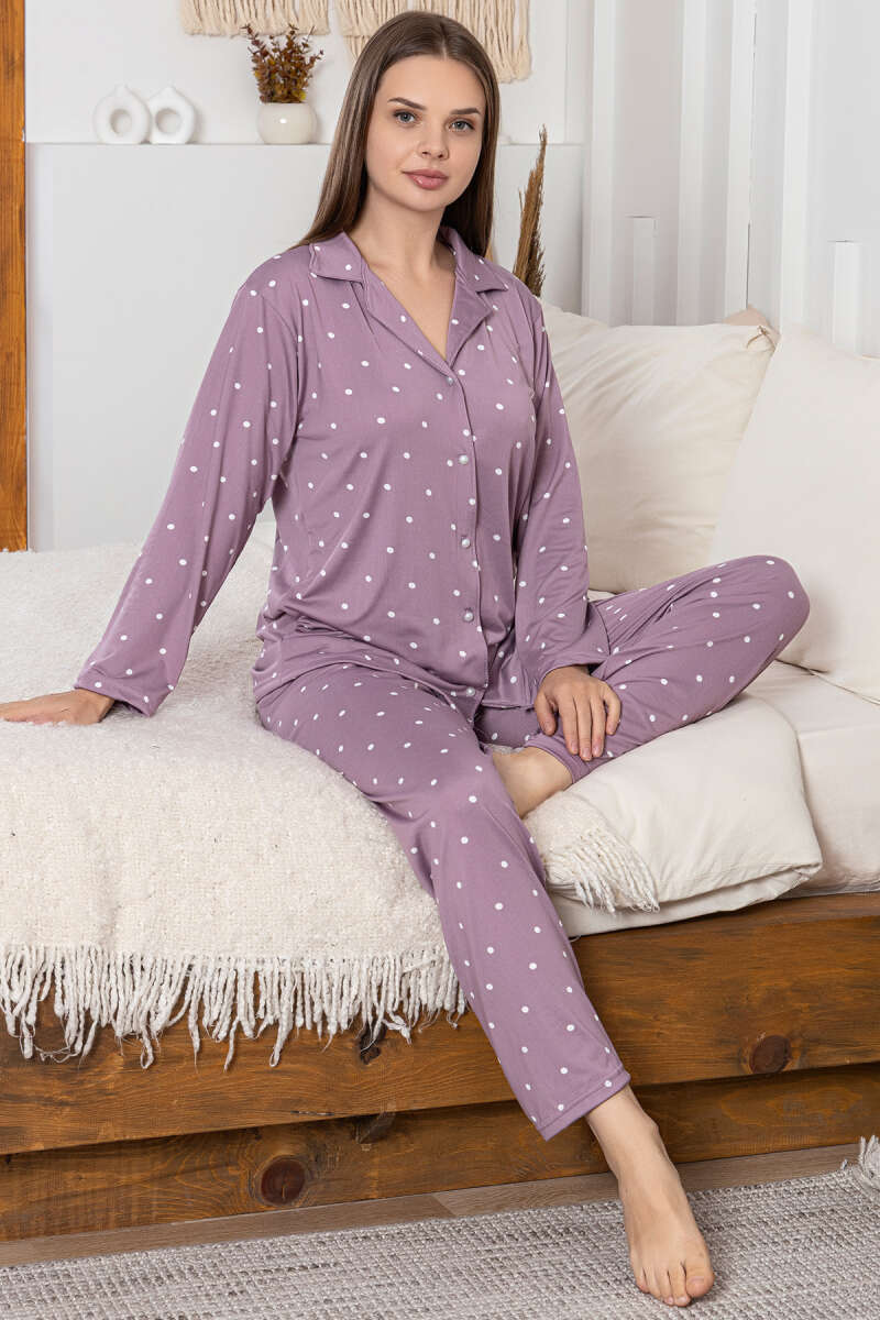 Puantiye Desenli Düğmeli Pijama Takımı Lila