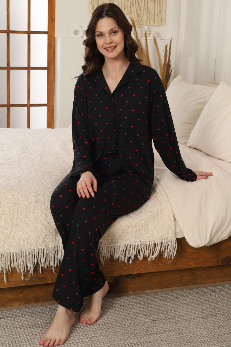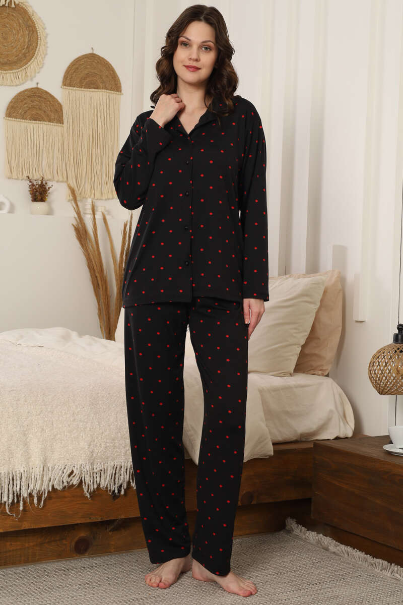 Puantiye Desenli Düğmeli Pijama Takımı Siyah Kırmızı