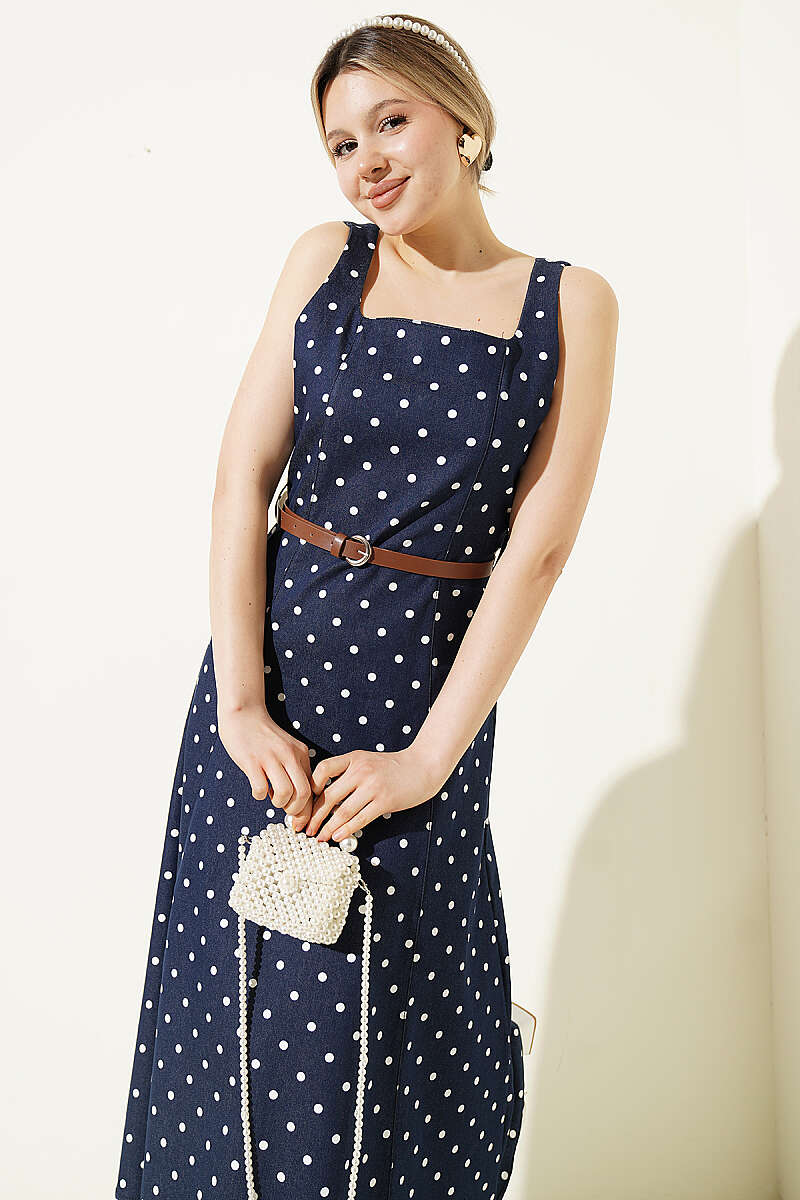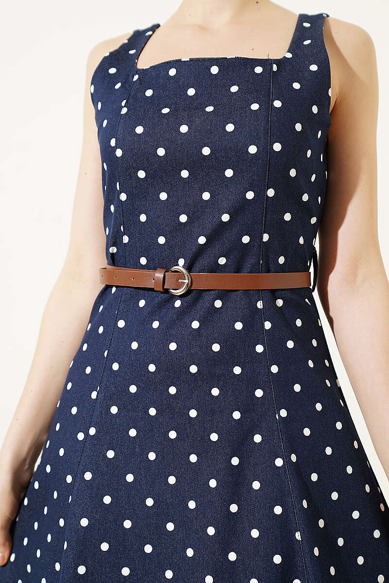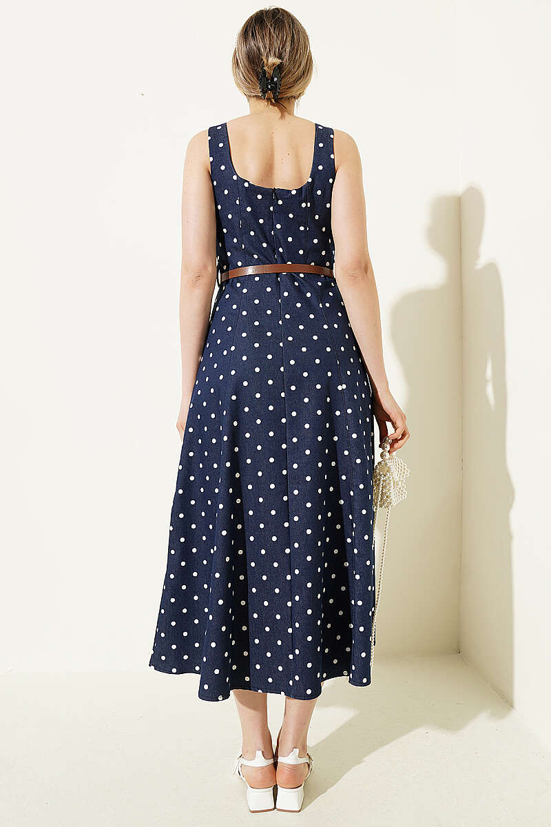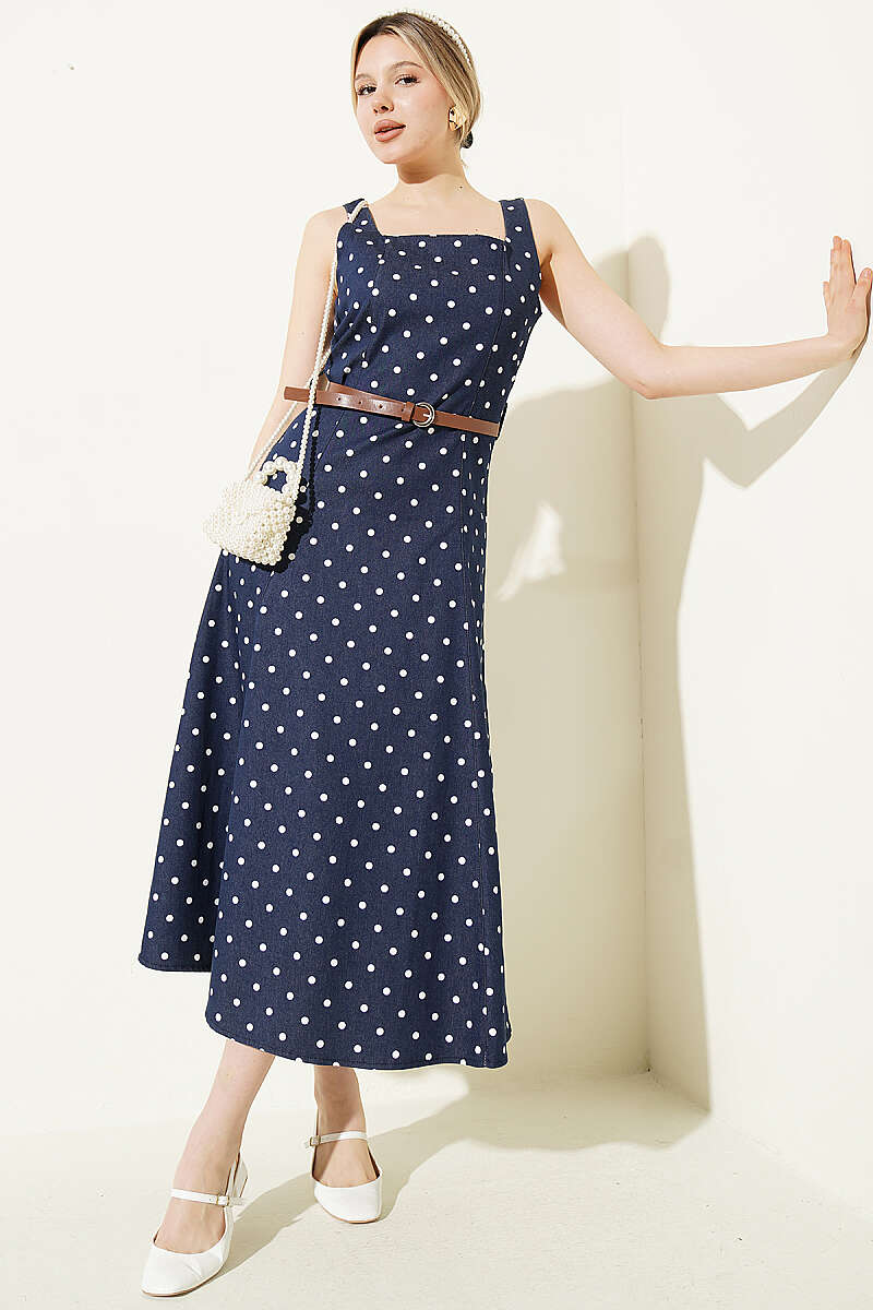 Puantiye Desenli Kemerli Elbise Lacivert