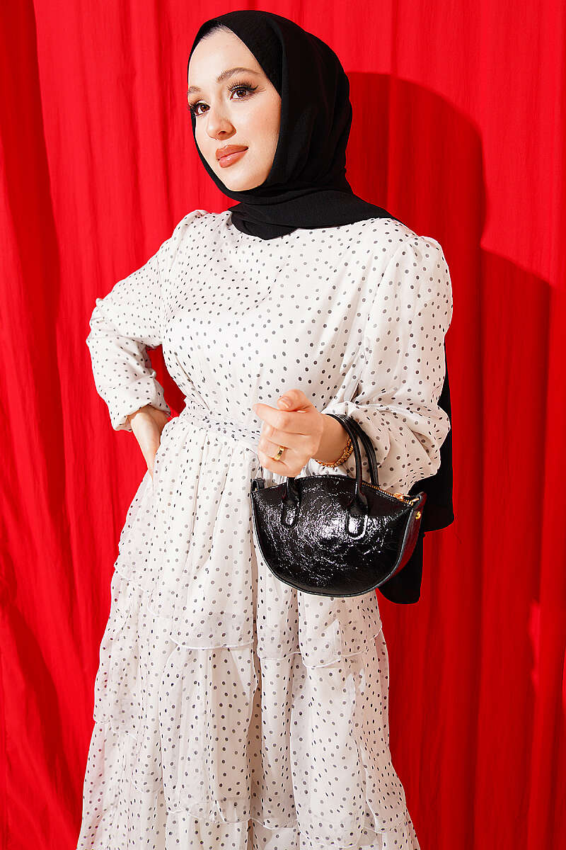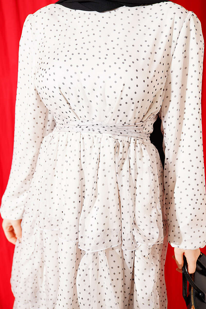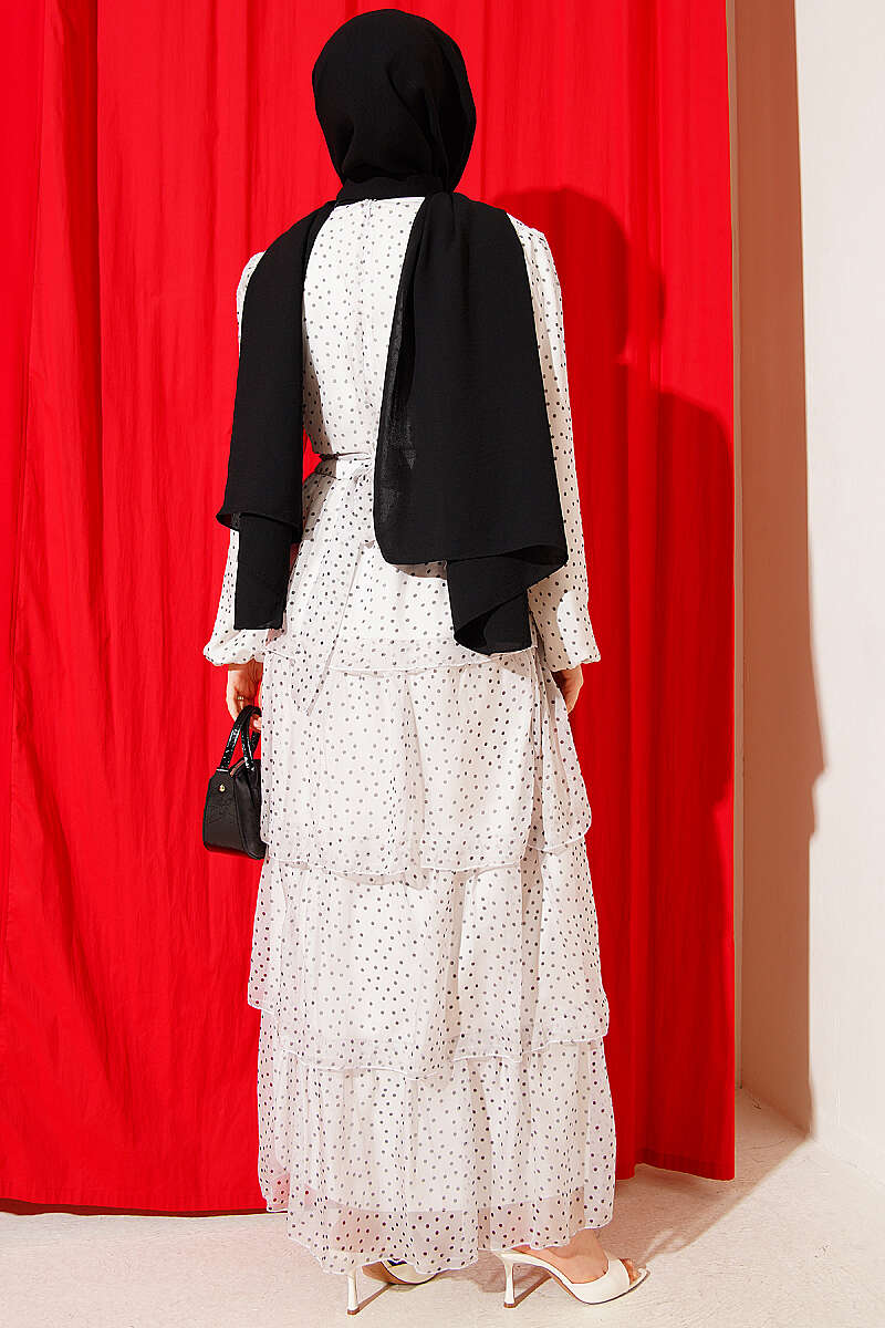 Puantiyeli Kat Kat Şifon Elbise Ekru
