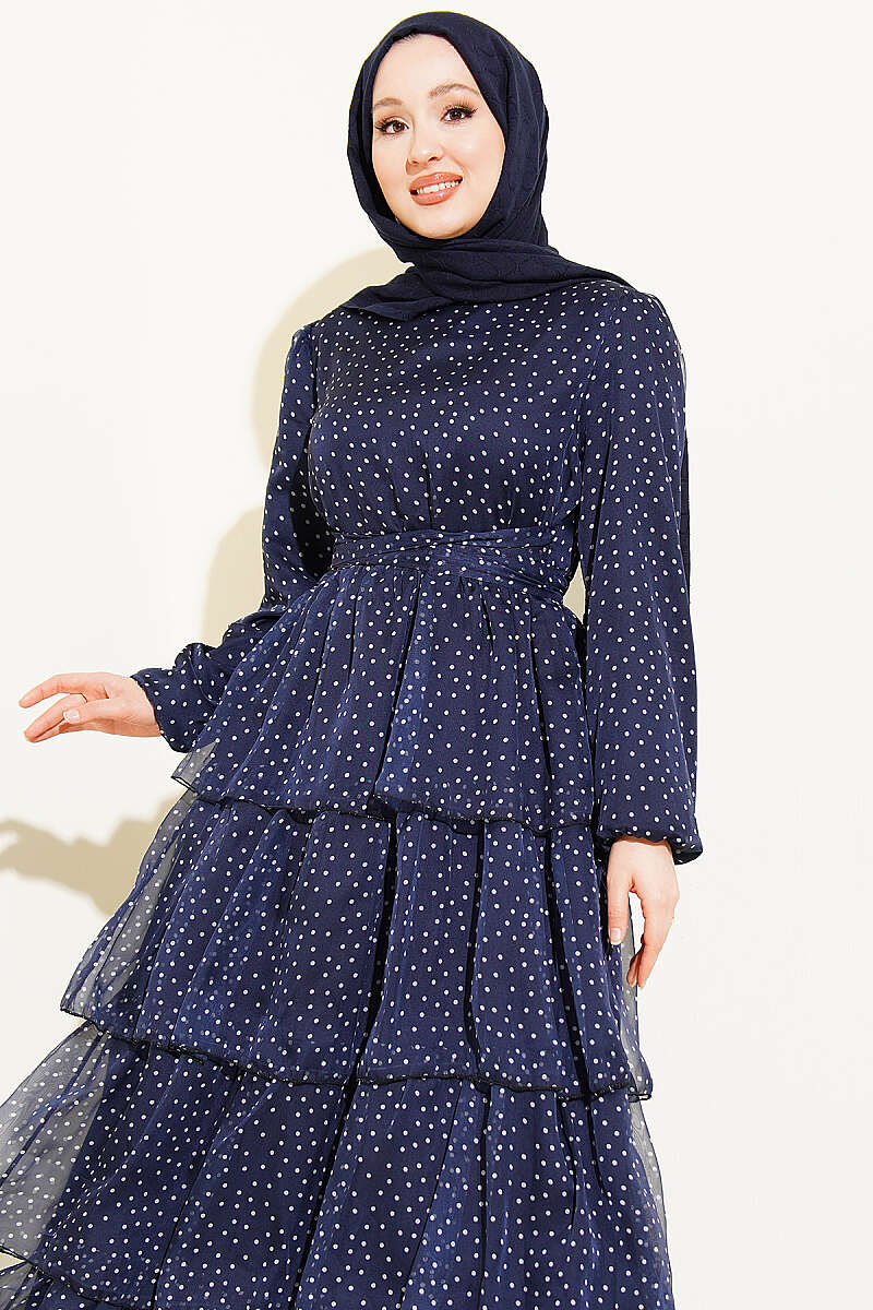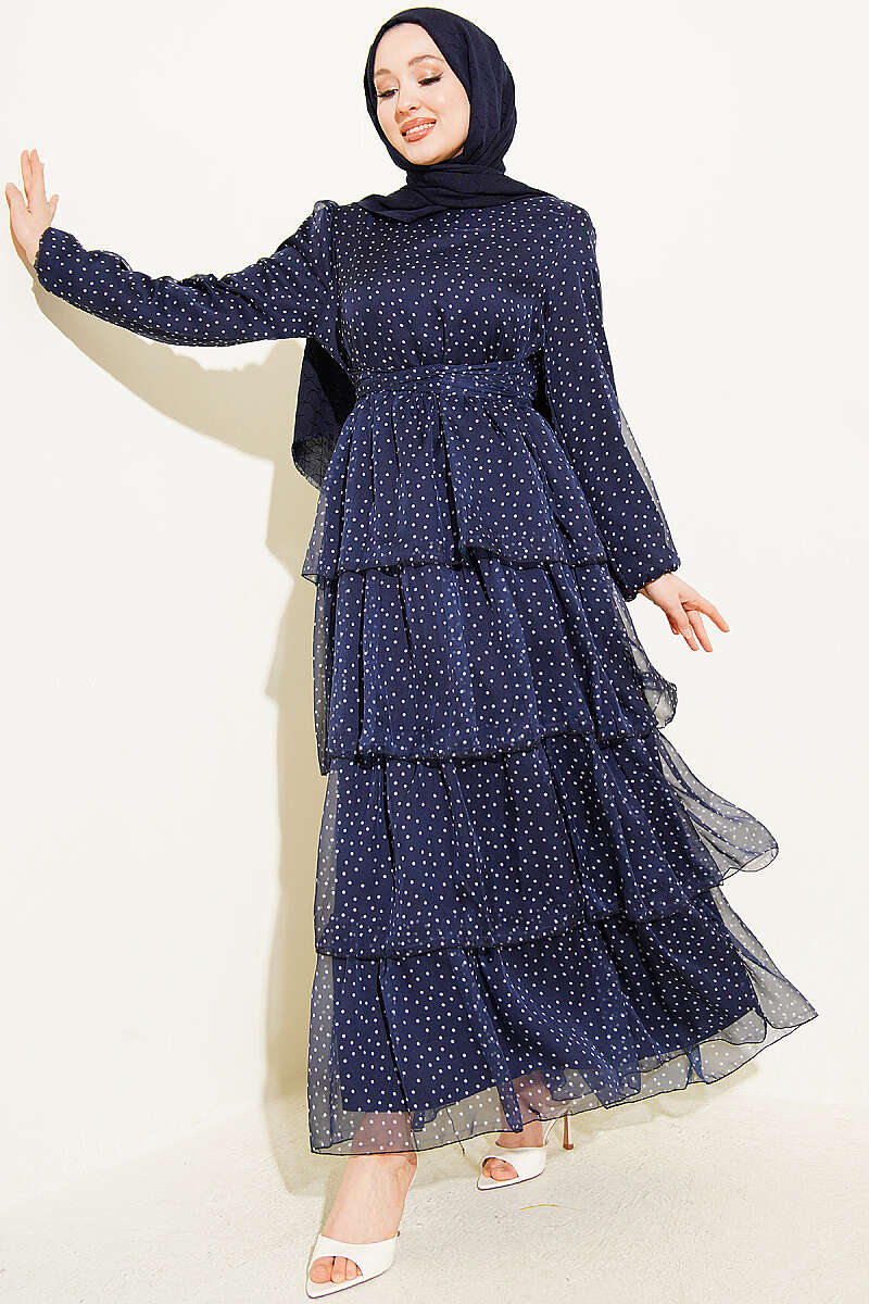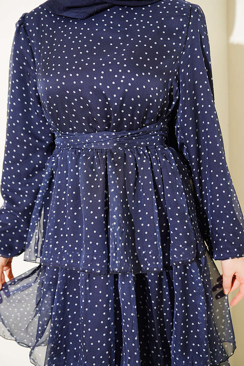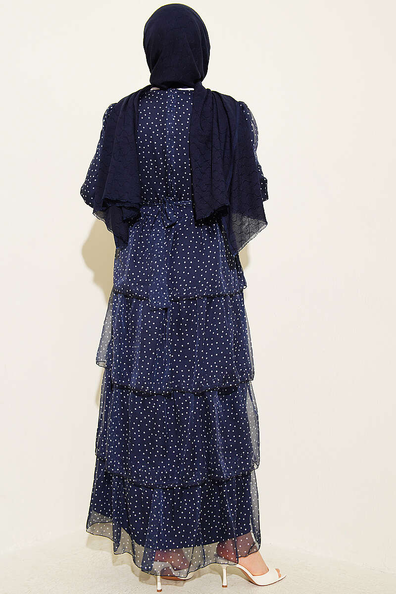 Puantiyeli Kat Kat Şifon Elbise Lacivert