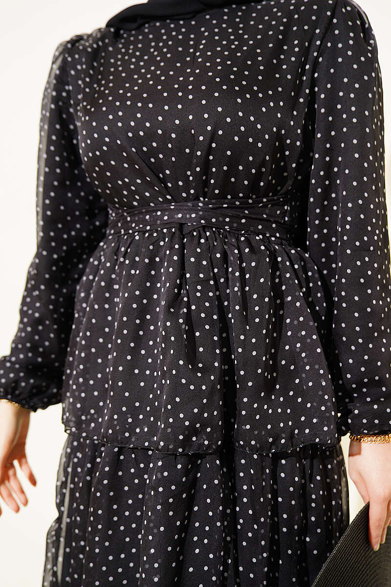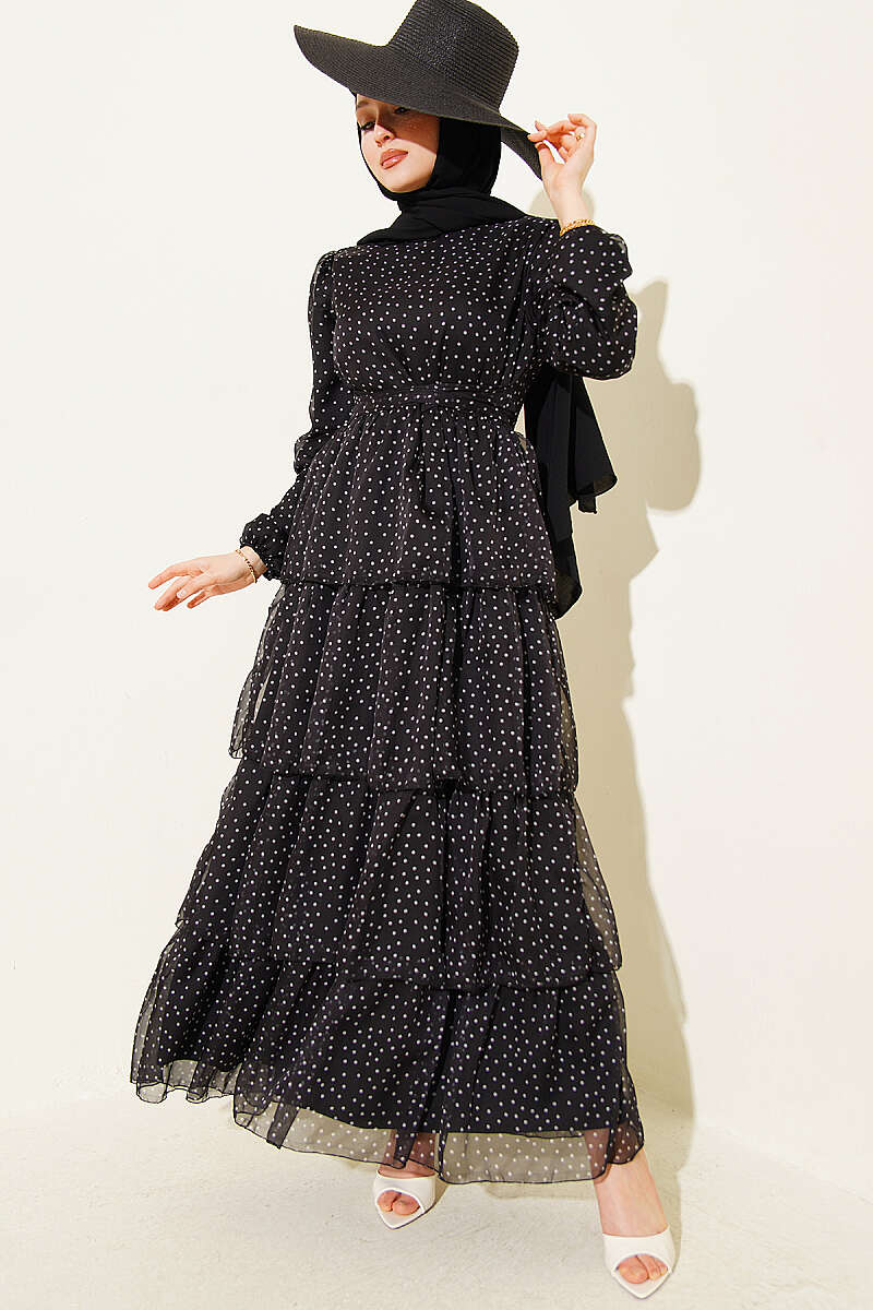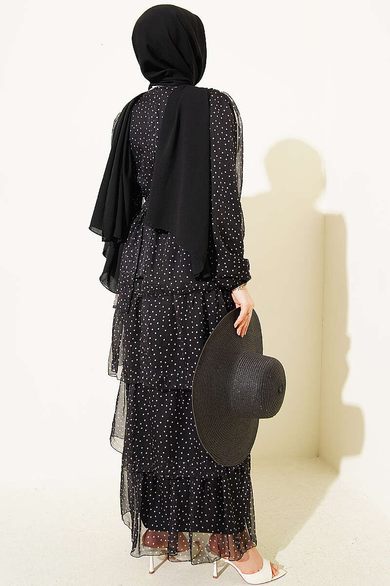 Puantiyeli Kat Kat Şifon Elbise Siyah