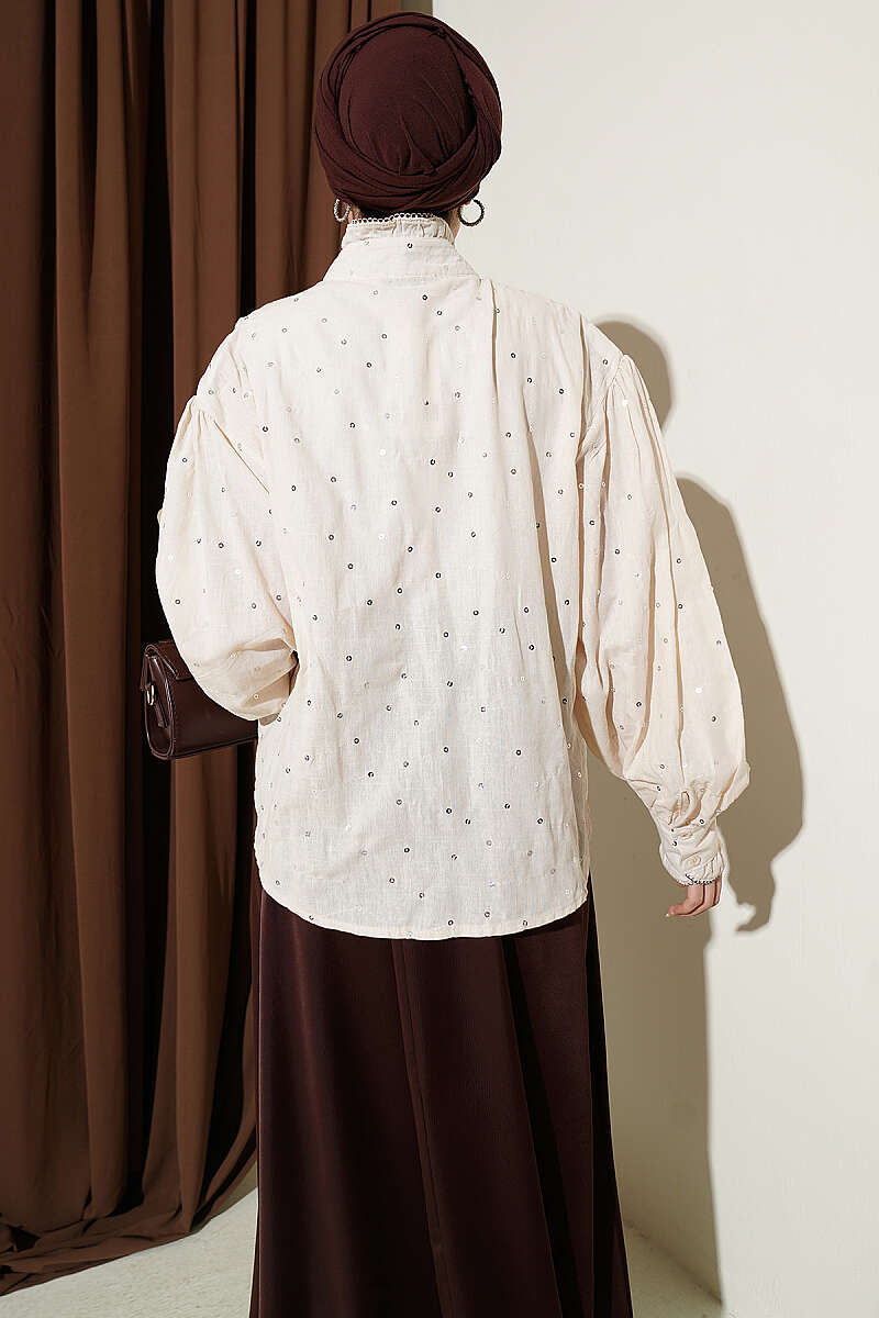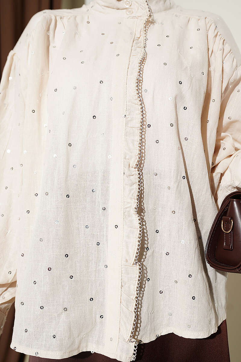 Pul Detaylı Balon Kol Kısa Gömlek Bej