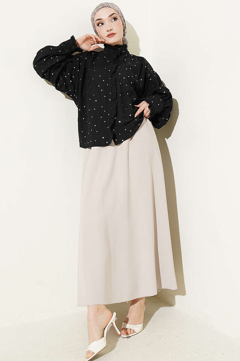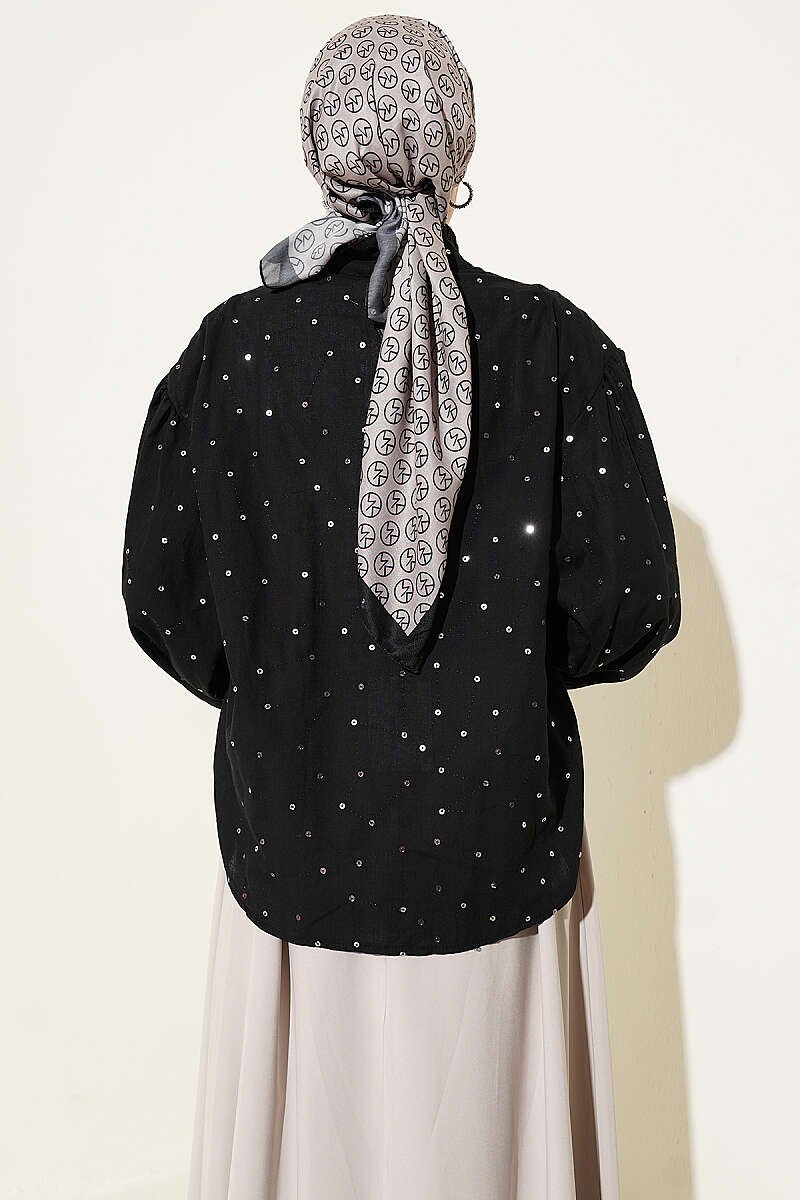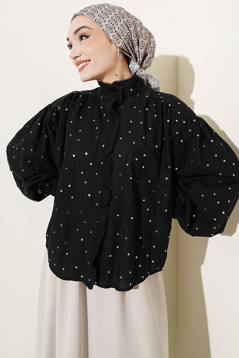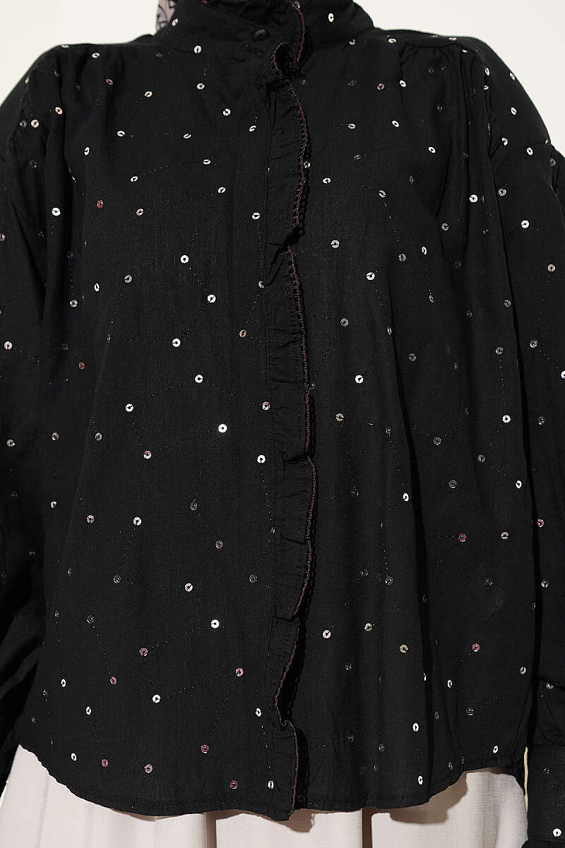 Pul Detaylı Balon Kol Kısa Gömlek Siyah