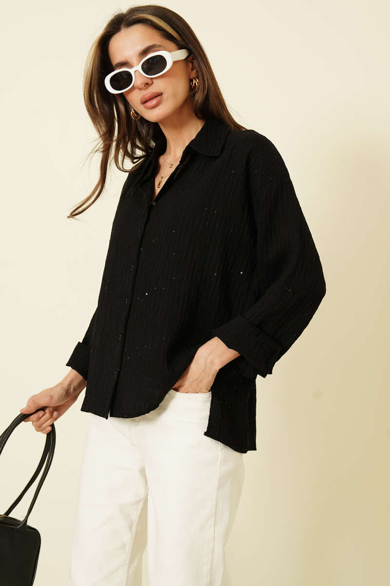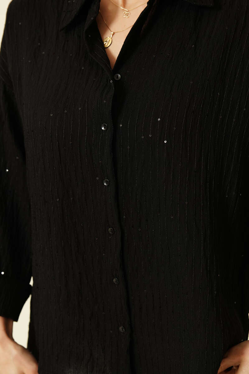 Pul Detaylı Çizgi Kabartma Gömlek Siyah