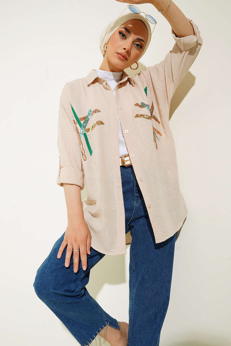 Pul Nakışlı Uzun Kollu Gömlek Bej