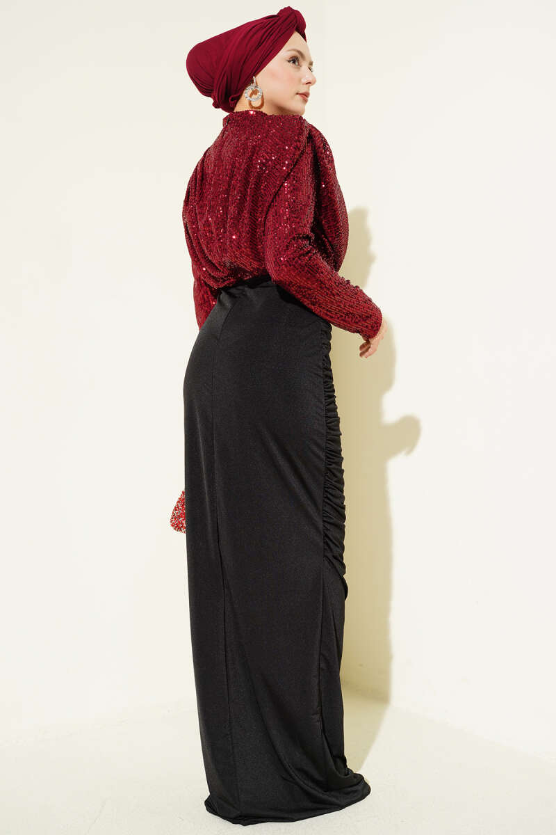 Pul Payet Büzgülü Abiye Elbise Bordo