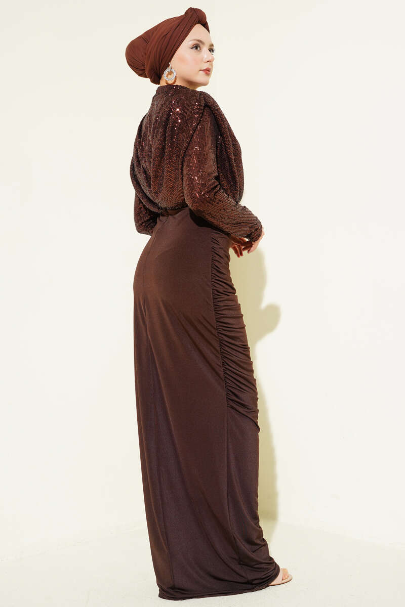 Pul Payet Büzgülü Abiye Elbise Kahve