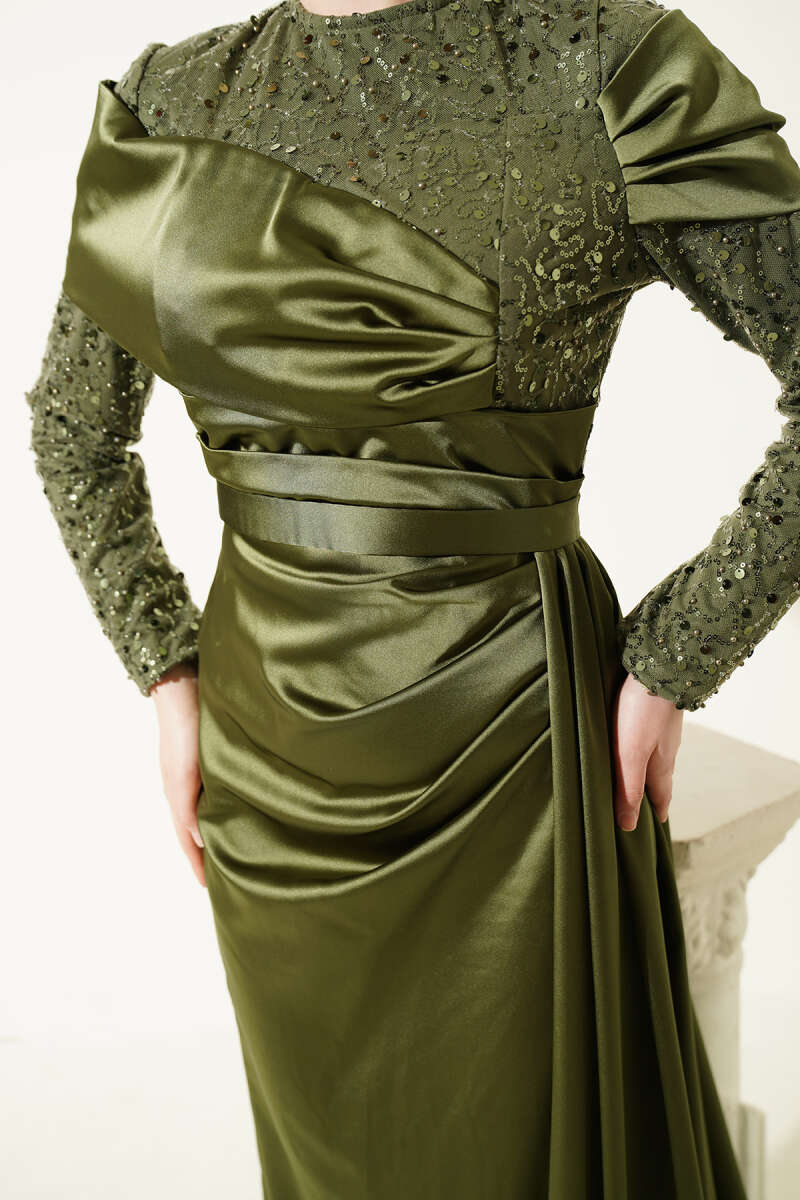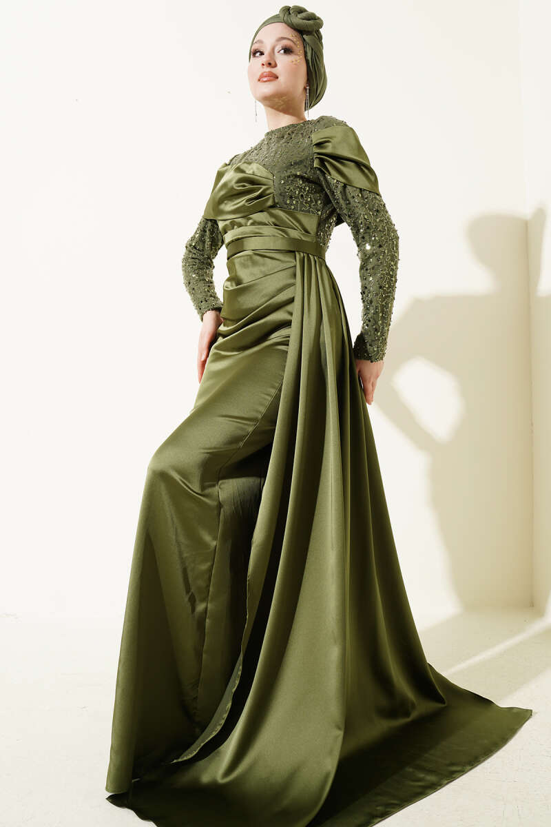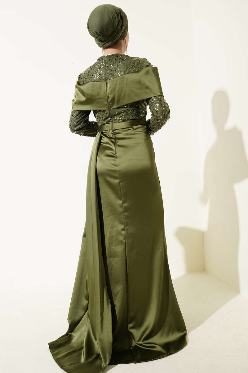 Pul Payet Detaylı Kuyruklu Abiye Elbise Haki