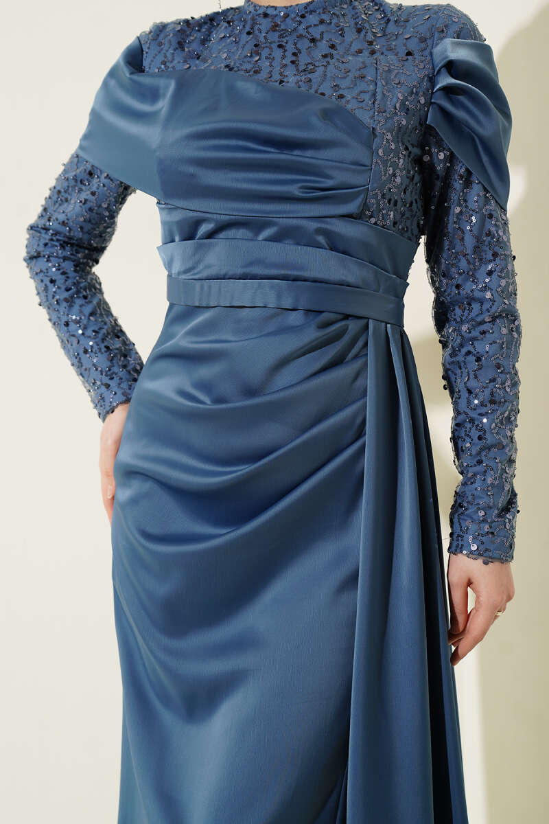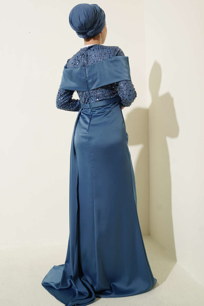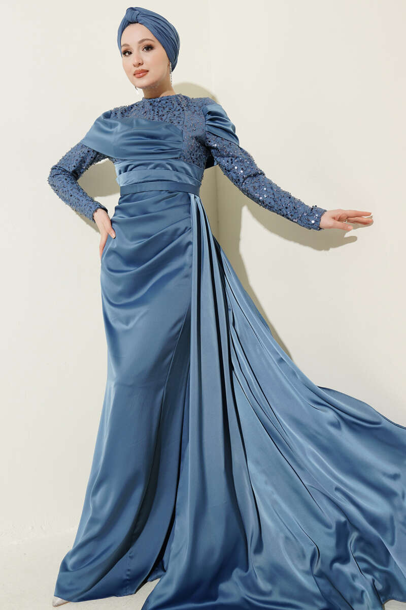 Pul Payet Detaylı Kuyruklu Abiye Elbise Mavi