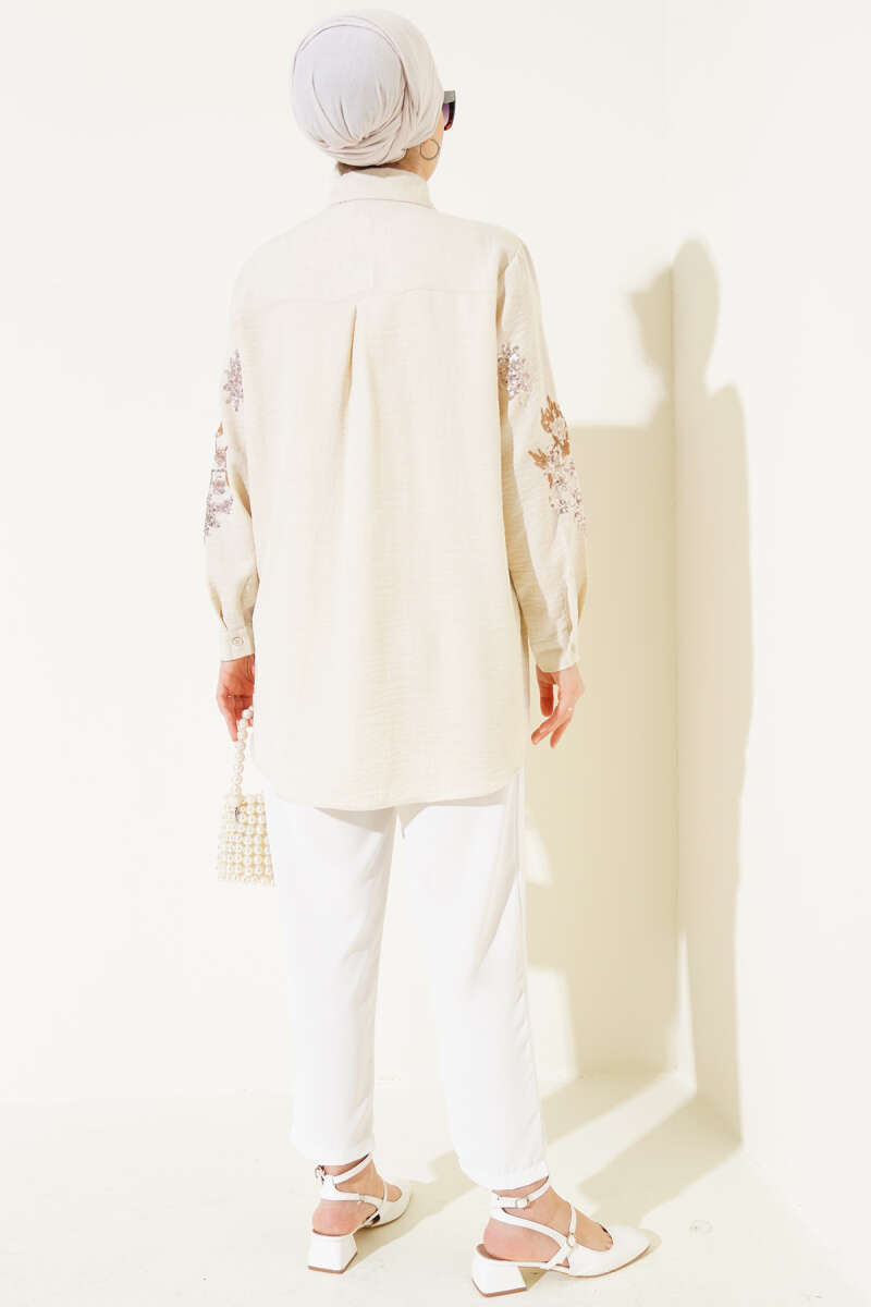 Taş Düğmeli Omuz Pileli Gömlek Bej