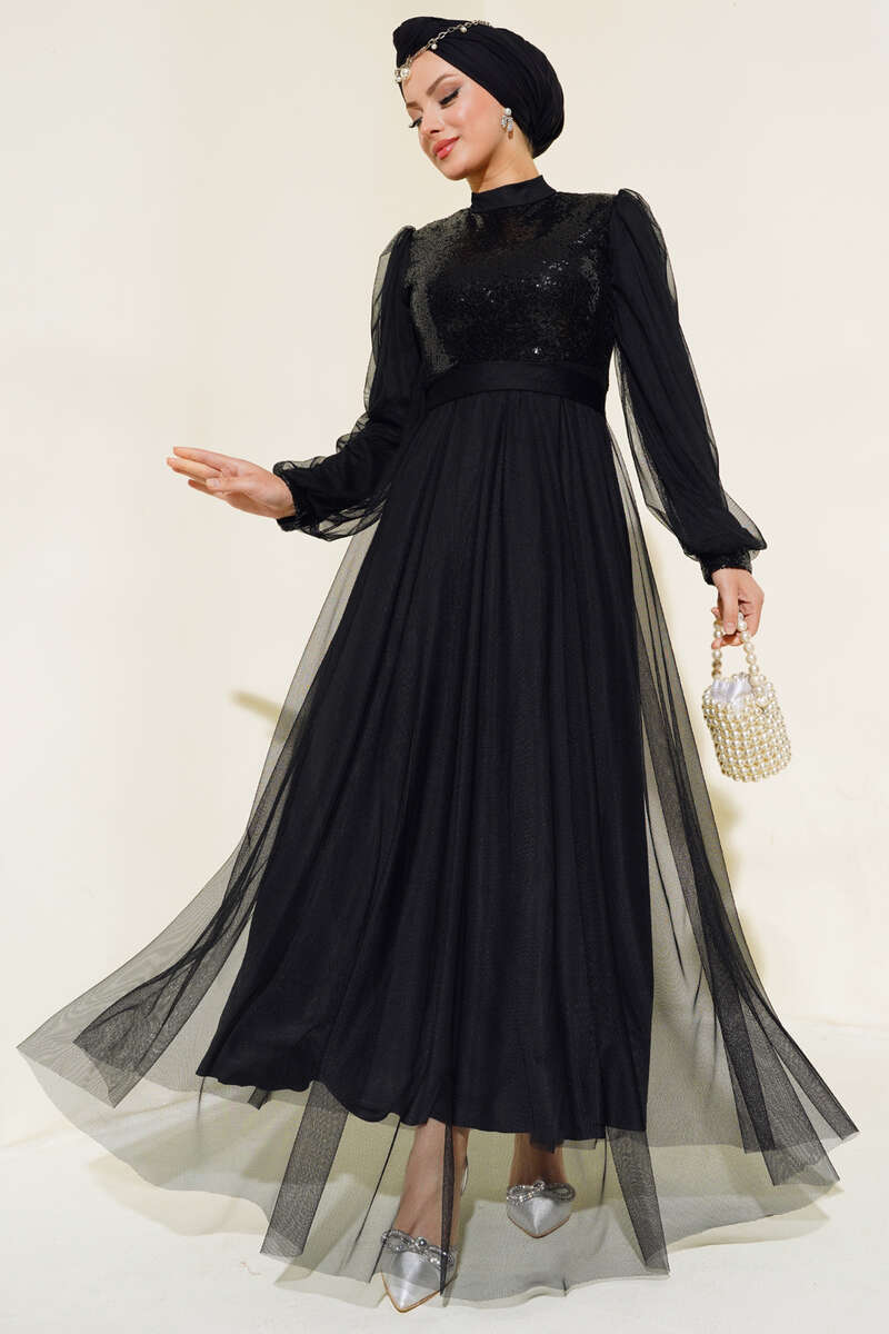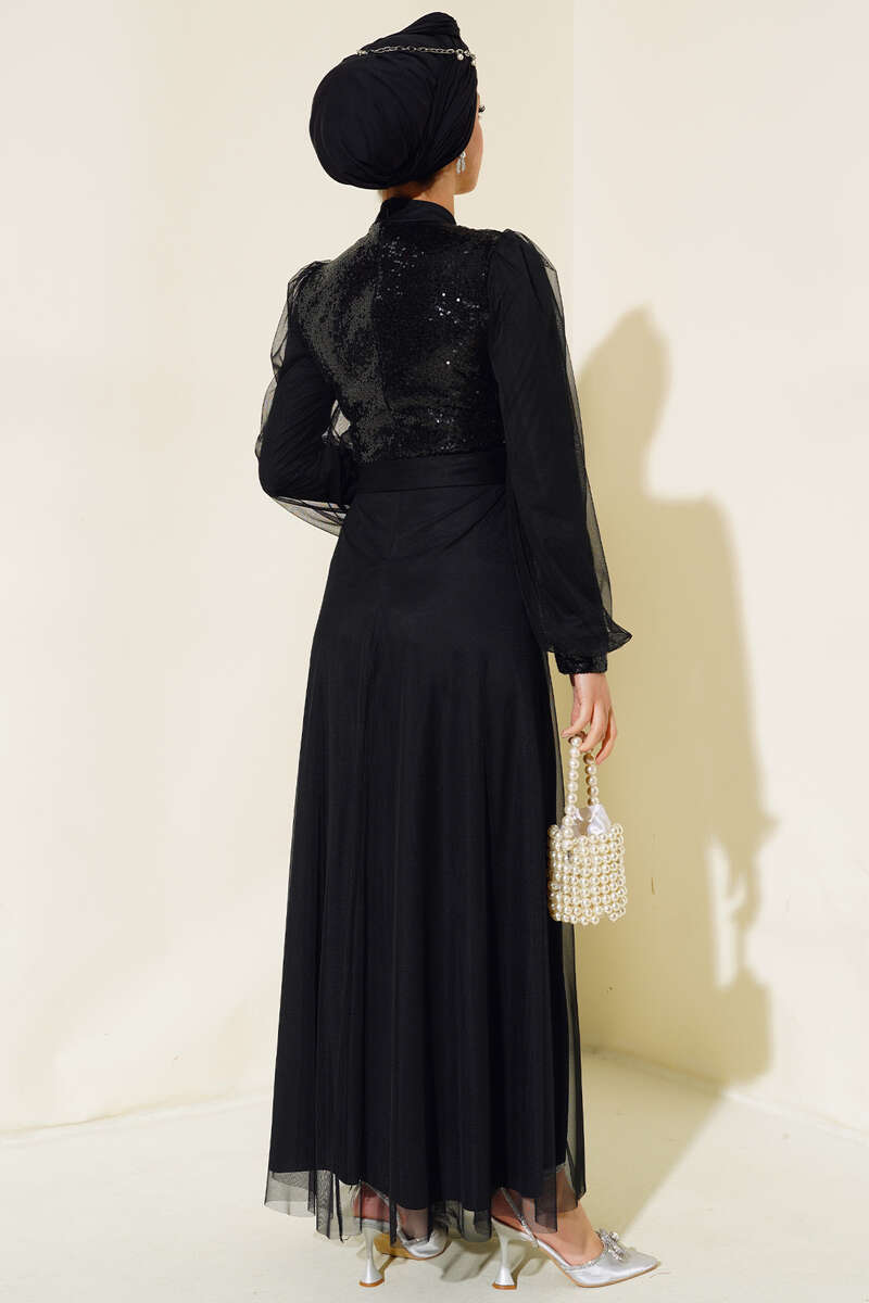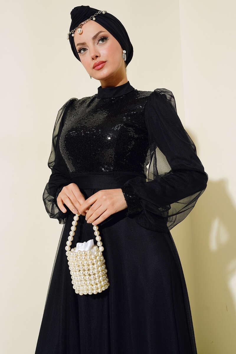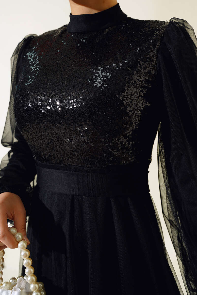 Pul Payet Tül Abiye Elbise Siyah