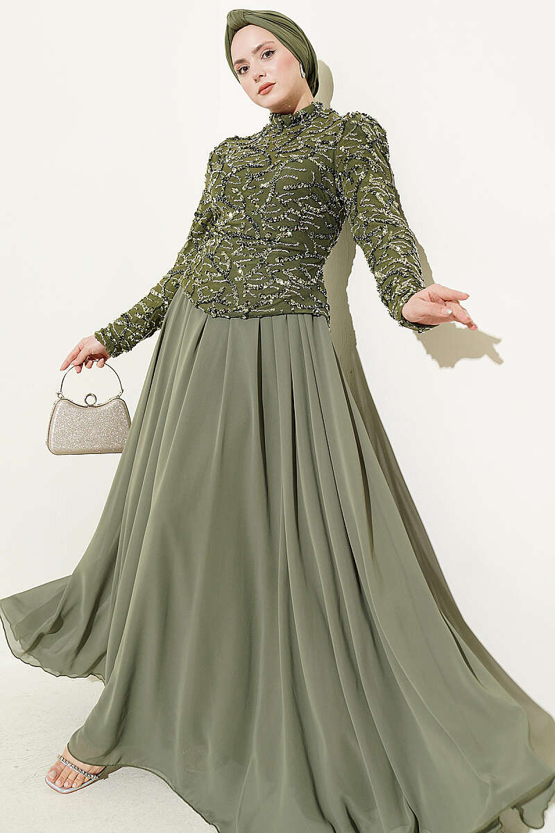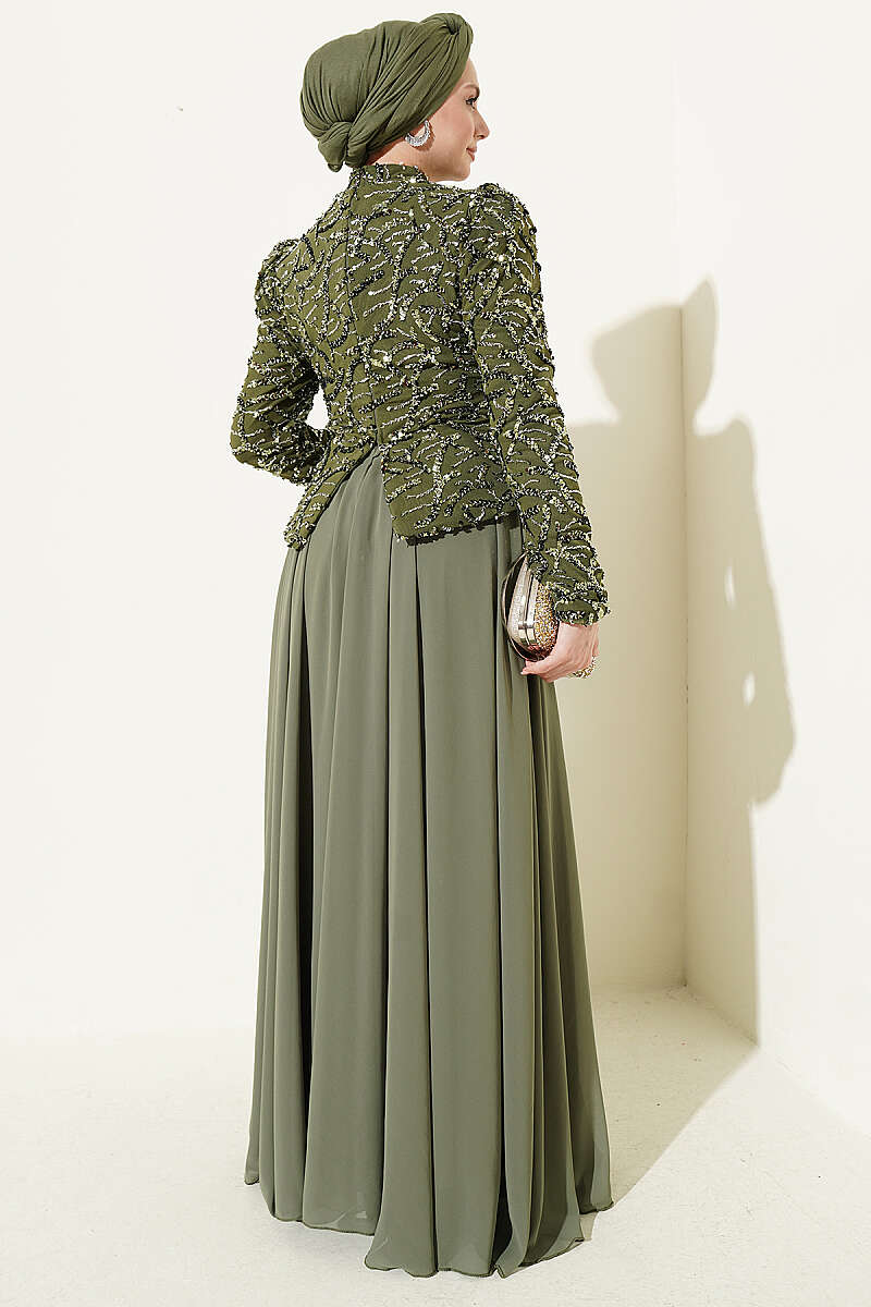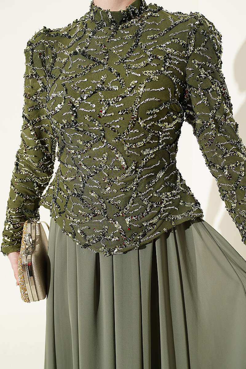 Pul Payet Ve Boncuk İşlemeli Abiye Haki