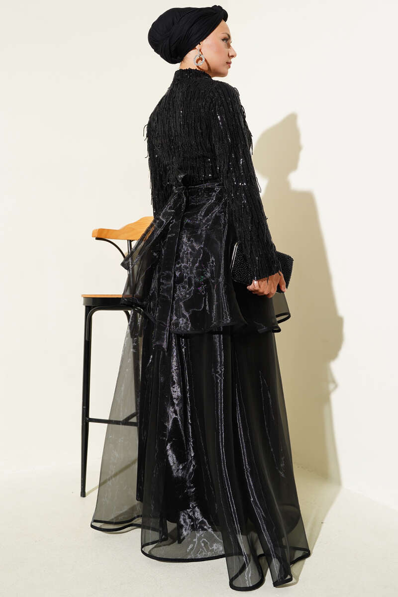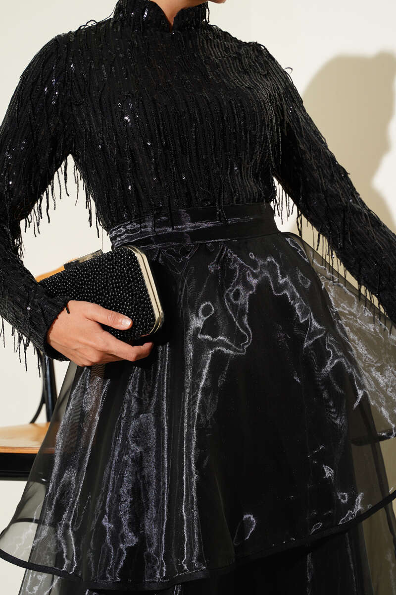 Omuz Pelerinli Taş Detaylı Abiye Elbise Siyah