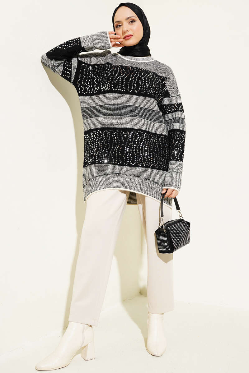 Salaş Bisiklet Yaka Simli Triko Tunik Taş