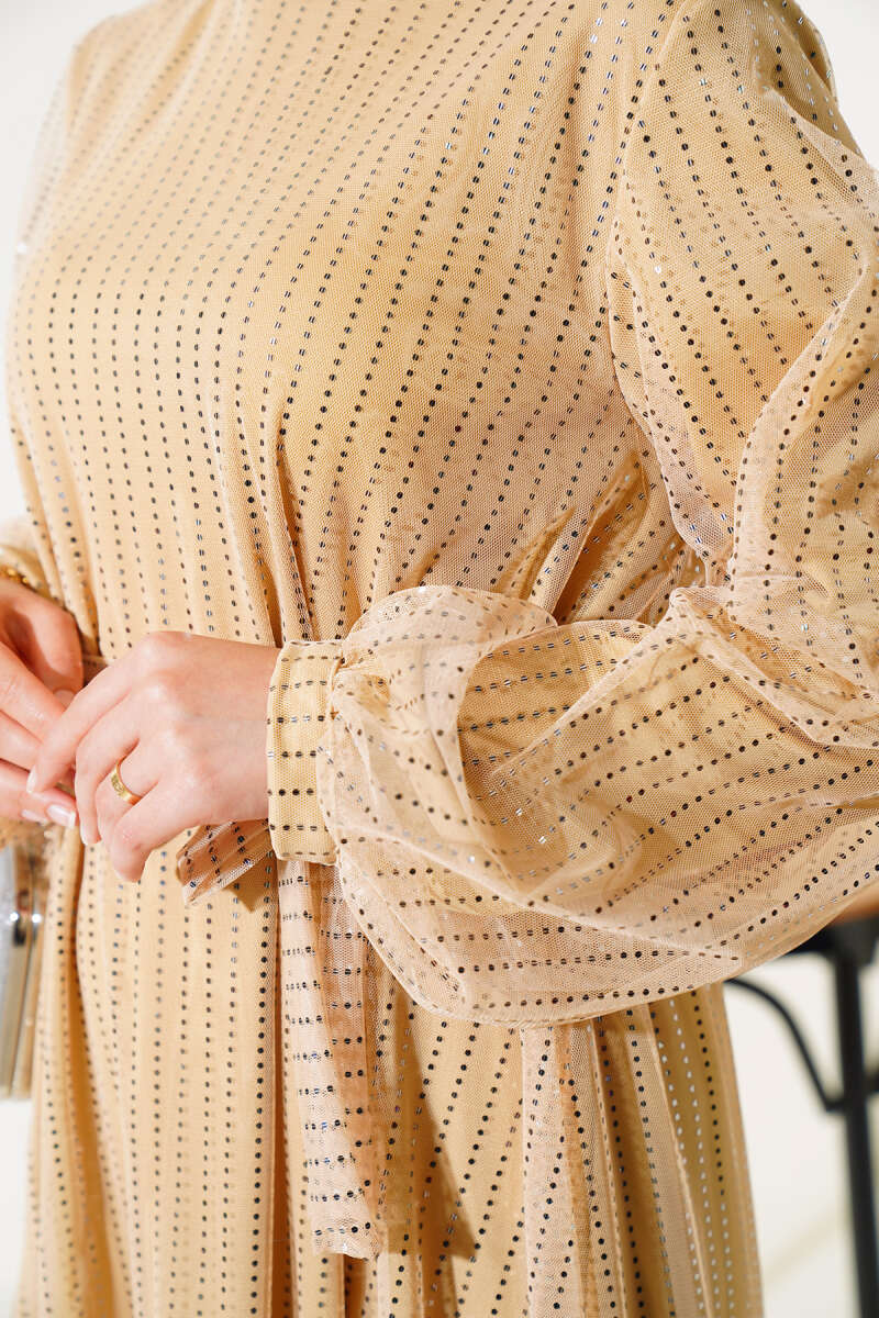 İp Kuşaklı Ajurlu Triko Elbise Vizon