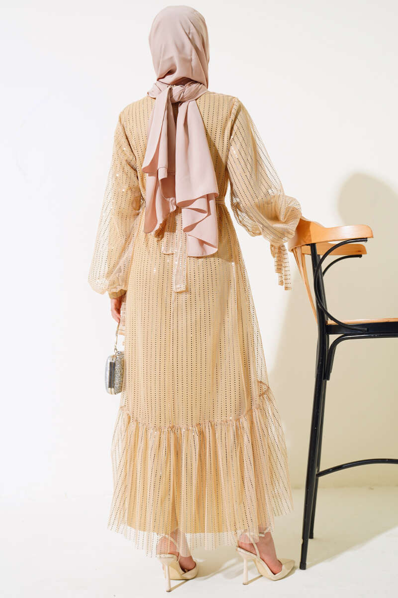Bel Taşlı Pelerinli Abiye Elbise Kahve