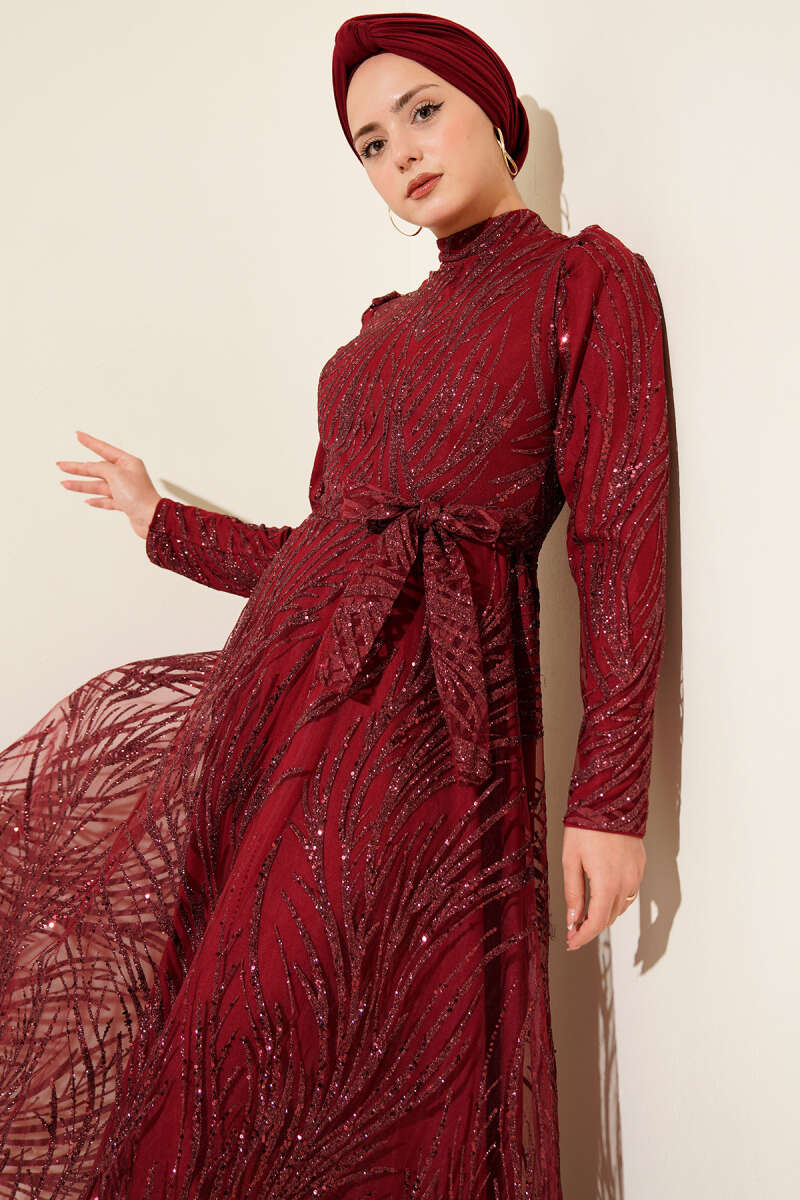 Boydan Düğmeli Simli Kat Abiye Elbise Bordo