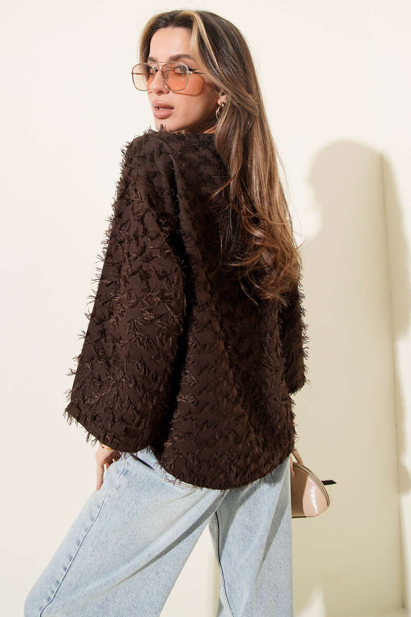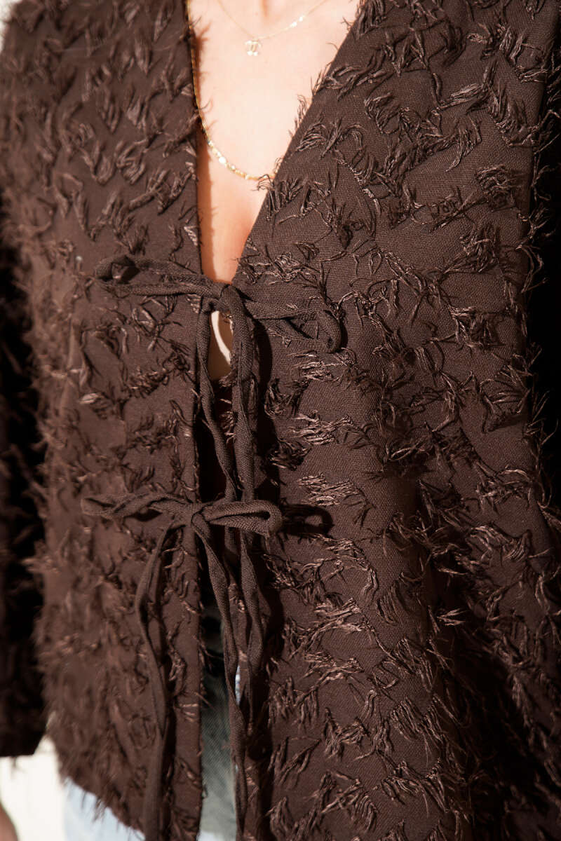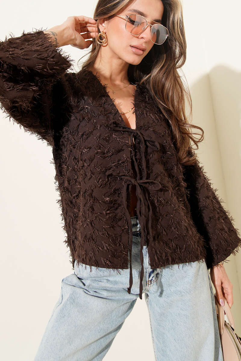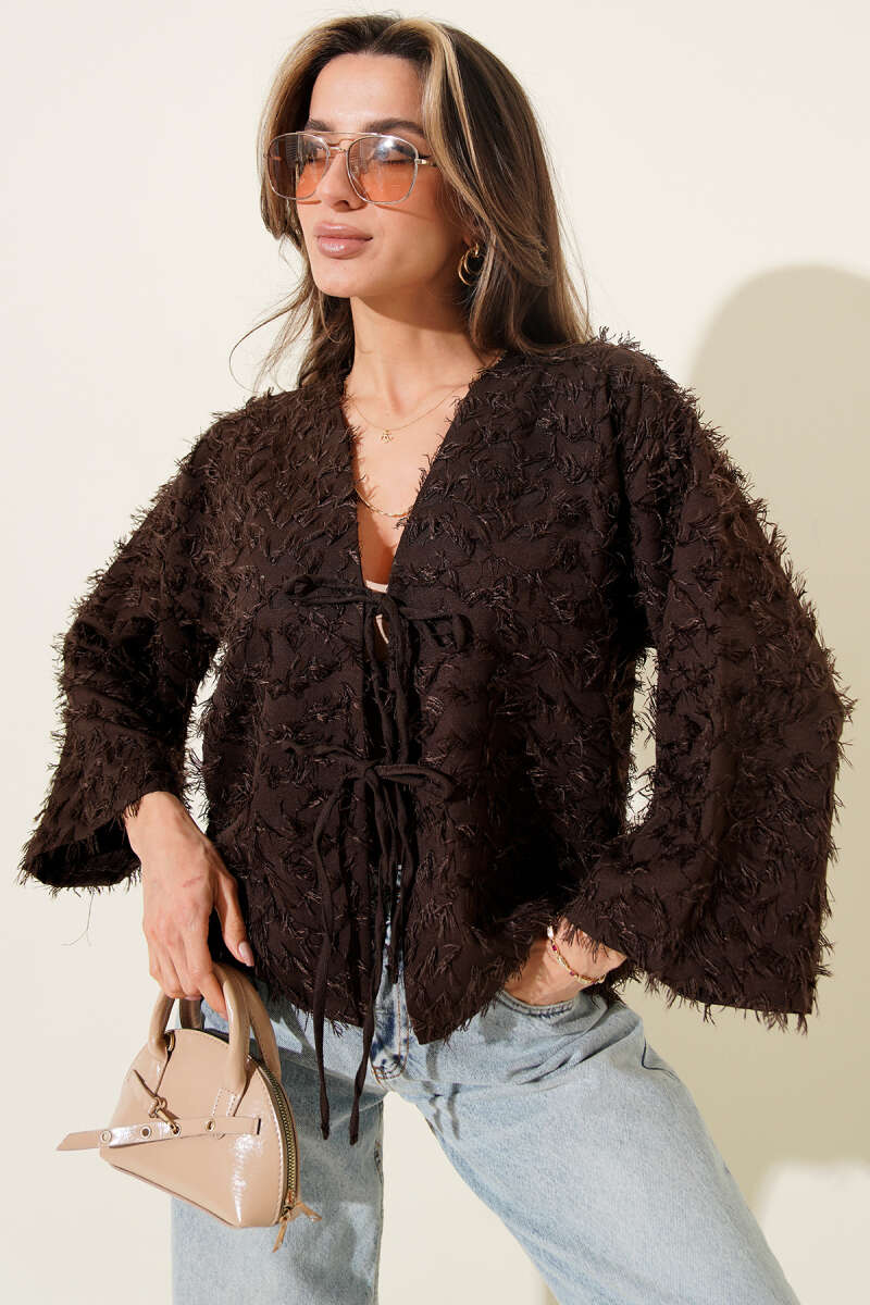 Püskül Detaylı Bağcıklı Kimono Kahve