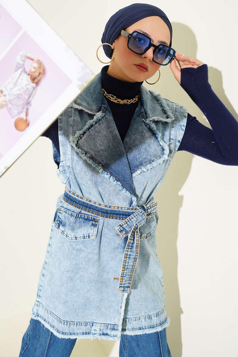 Kruvaze Yaka Kuşaklı Buklet Yelek Lacivert