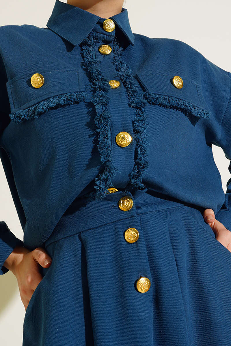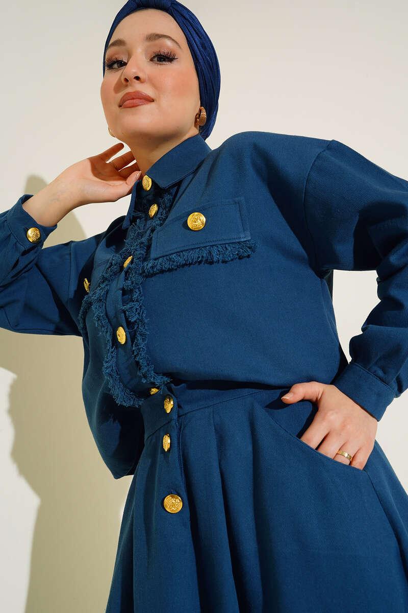 İkili takımımız etek ve tunik şeklindedir. Tunik düğmeli model olup püskül detaylarına sahiptir. Buton düğmeli tuniğimizde iki adet süs cep bulunmaktadır. Etek kloş modele sahiptir ve cepli modeldir. Etek beli lastikli ve esnektir.